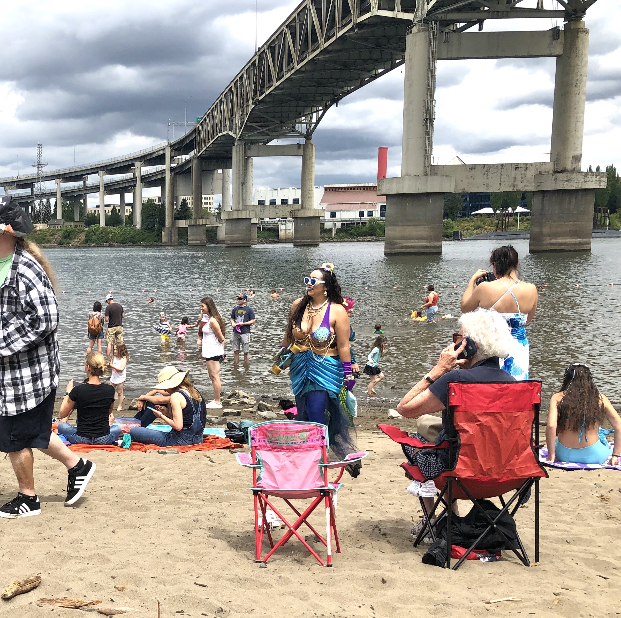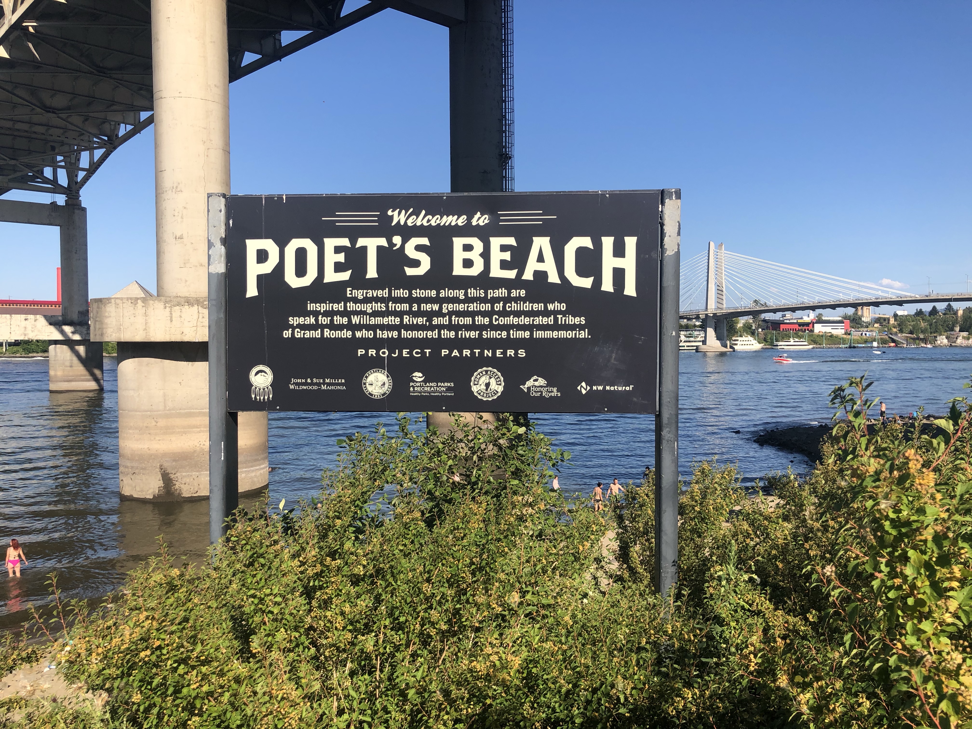 We’d know about Poet’s Beach since it opened. The city’s public relations staff got the word out. It’s now a tradition to make at least one visit each summer to this makeshift beach under the Marquam Bridge. It was the end point of the Portlandia Mermaid Parade allowing the assembled mermaids a place to take a dip. The lines of student poetry inscribed on the rocks leading to the beach have faded somewhat but the beach area is wide for a steady stream of visitors. The river is clean, thanks to the big dig project making a rare occurrence out of the sewage overflows that used to make the river unsafe for swimming at times.