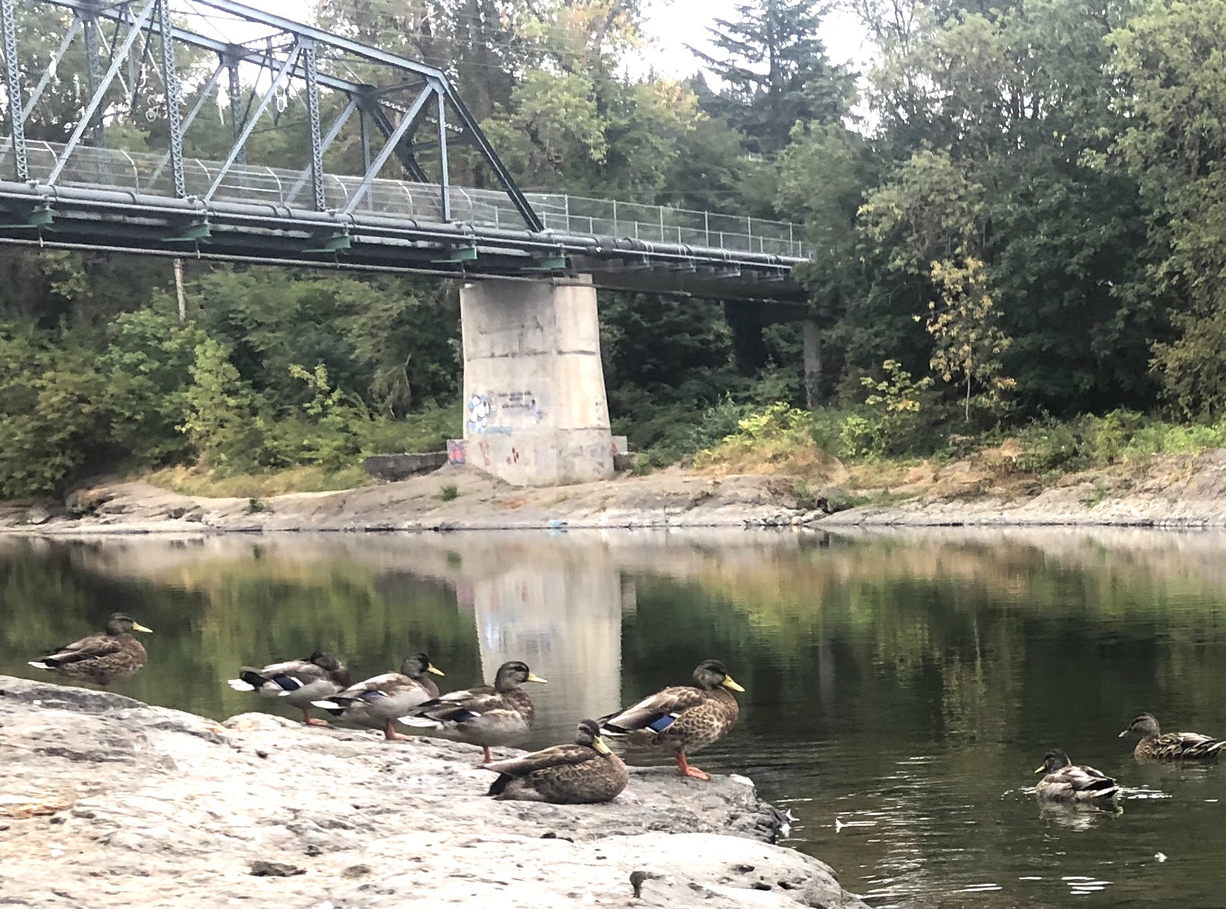 You can go to High Rocks Park or Cross Park, either offers access to the Clackamas River. Cross Park seemed to be more accessible when we dashed down to the Gladstone area for a Friday afternoon happy hour swim. The river wasn’t crowded in the area where we parked. A guy standing in the water told me I’d get used to it if I ever got brave enough to get wet and I did. Minutes later he got in a kayak and paddled away. Our dog had a blast swimming until we scolded him for swimming downstream to chase ducks. The river bed was rocky but despite the current and the mountain run off it wasn’t too cold or treacherous. The water was just right for cooling off after a hot week.