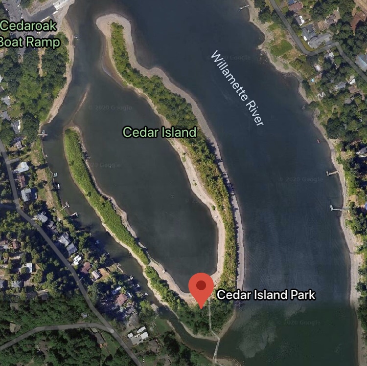 Who could resist a visit to an island off the coast of West Linn? It’s about as much status as anyone could hope for. In my possibly misguided geological knowledge, it’s a kind of jetty created by the Willamette River where a swimming pond has formed. We found parking outside a gated mansion although there’s boat ramp parking too. It’s necessary to walk through a riverside beach area and over a bridge to reach the island. Once there we had the rocky beach to ourselves. The water temperature was fine but you wouldn’t know it from my hesitant wade and squat technique for entering the water.