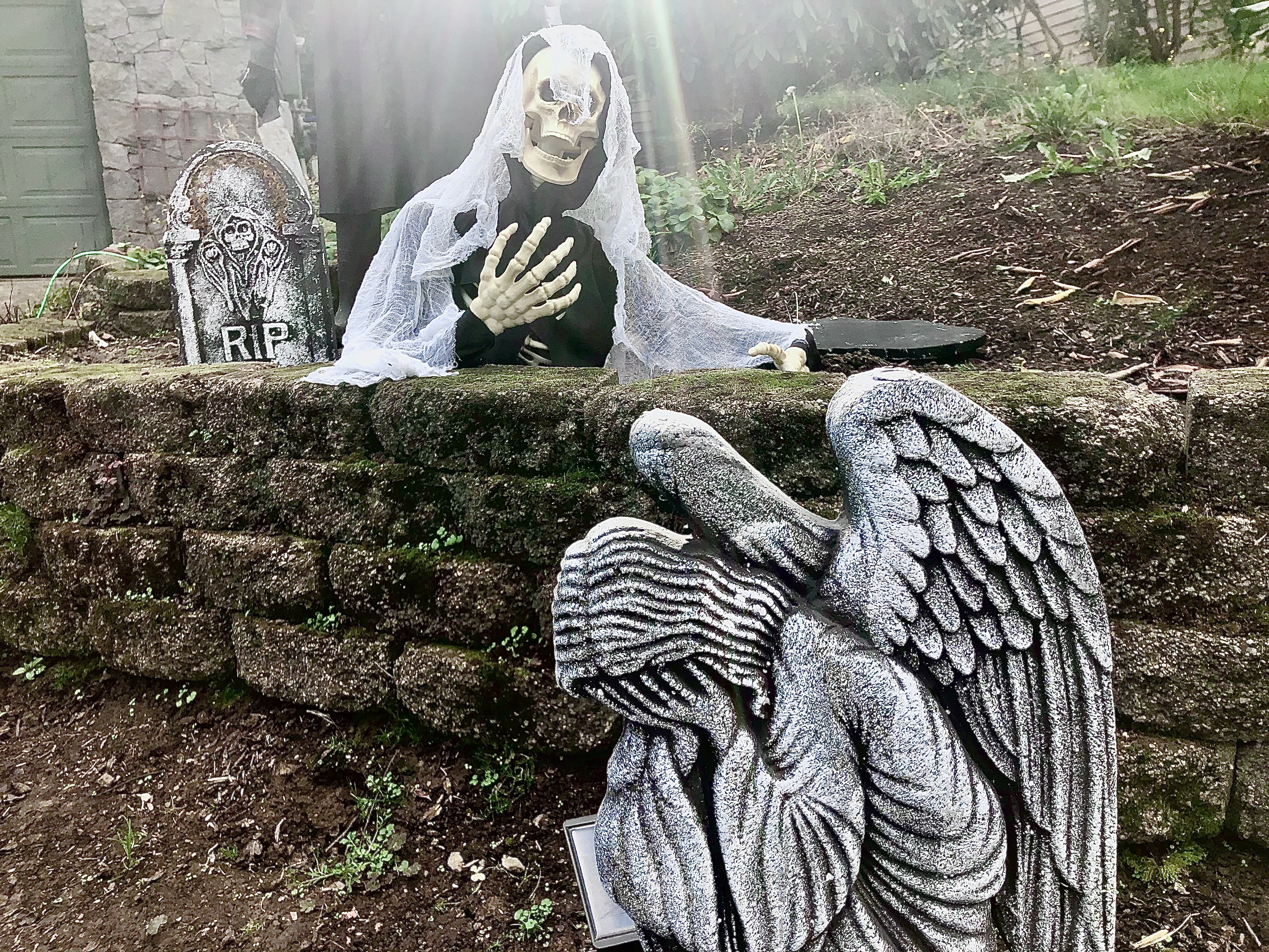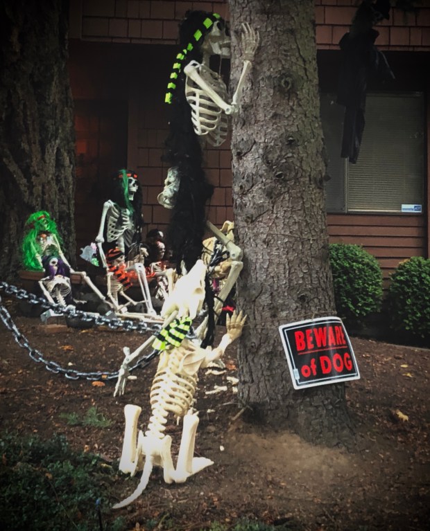 This Halloween is especially scary. If anyone shows up at your door the trick they might offer is a POTENTIALLY DEADLY VIRUS. I’m sure I’m wrong, but the Halloween decorations I spotted, many in SW Portland, depicted scenes of skeleton’s run amok leading me to wonder if we will all soon become skeletons ourselves. The creativity poured into these scenes of mayhem had me feeling even more uneasy. I long for next Halloween when fact and fiction may not be quite so intertwined which could bring back the sense of normalcy we’ve lacked in 2020.