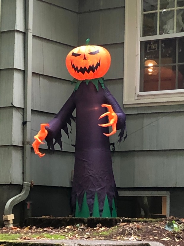 Inflatables air on the ho hum side of decor most of the time but this Pumpkin Master Beast Guy, spotted in the Grant Park neighborhood, is frightful. The bony, gnarled hands and the jagged smile made it especially photogenic.