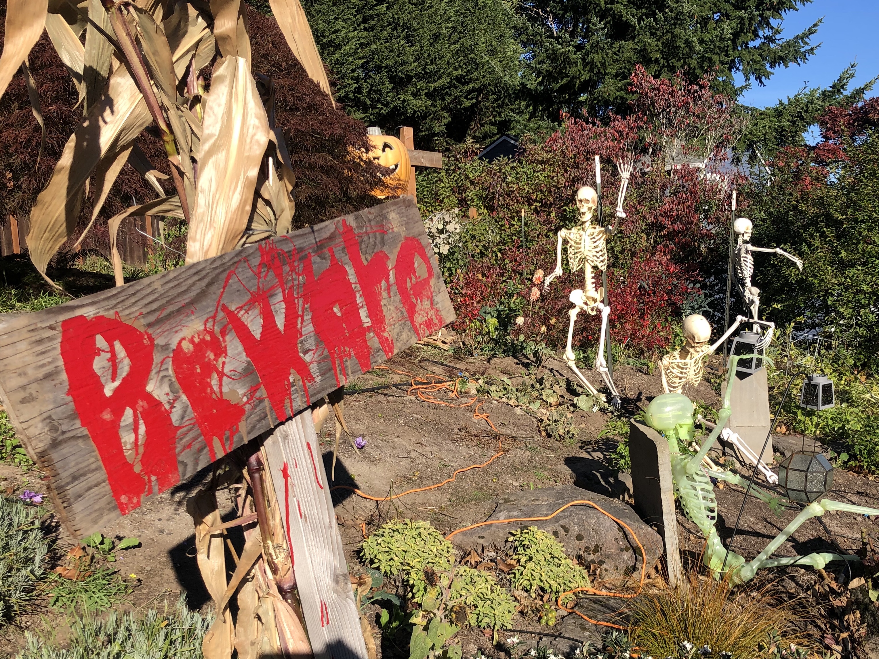 The bright sun takes all the fear and mystery out of Halloween displays like this one in West Portland Park. The skeleton in the back appears to be offering a neighborly wave. At least, the blood red sign lettering made me feel like I should really beware.