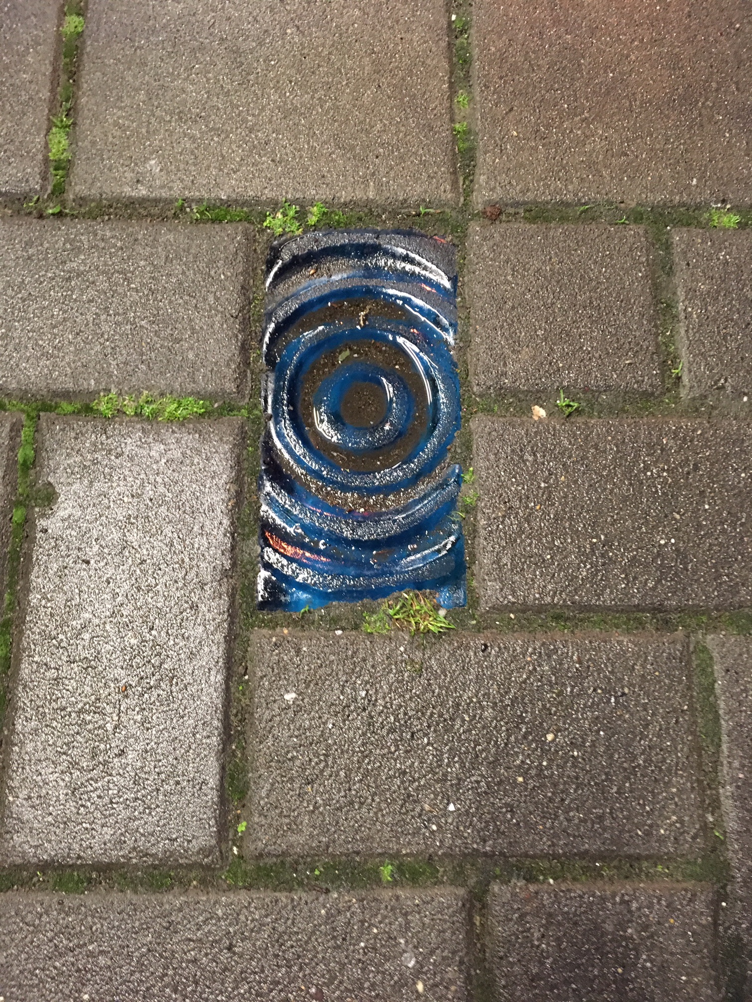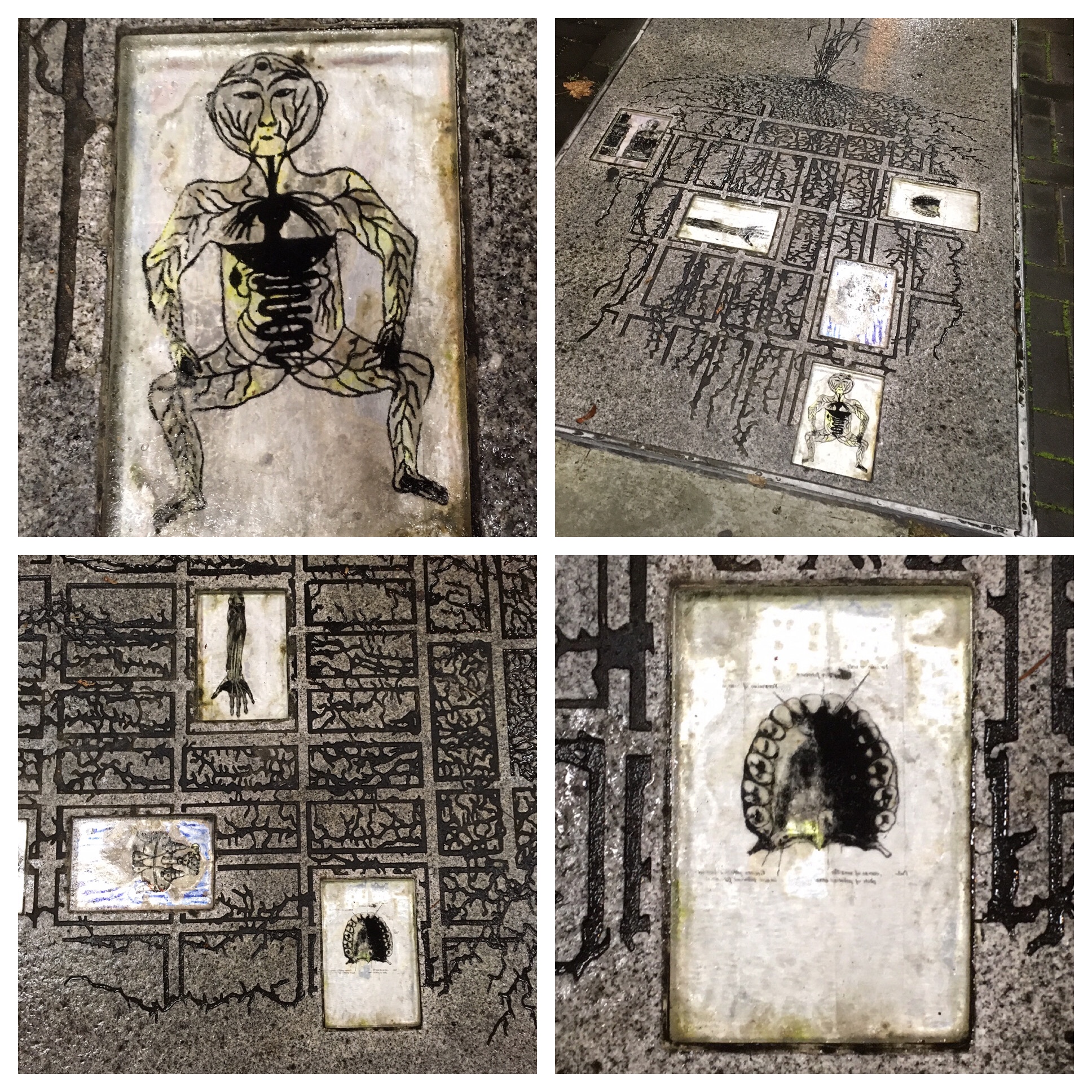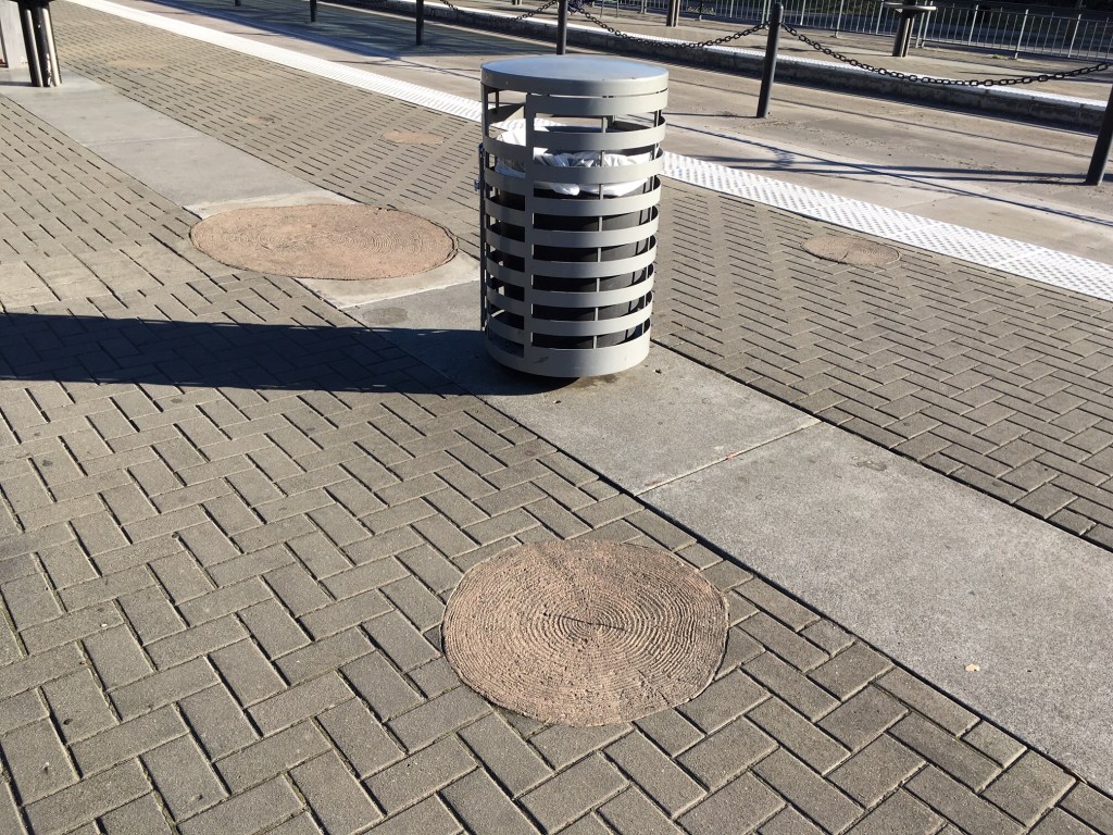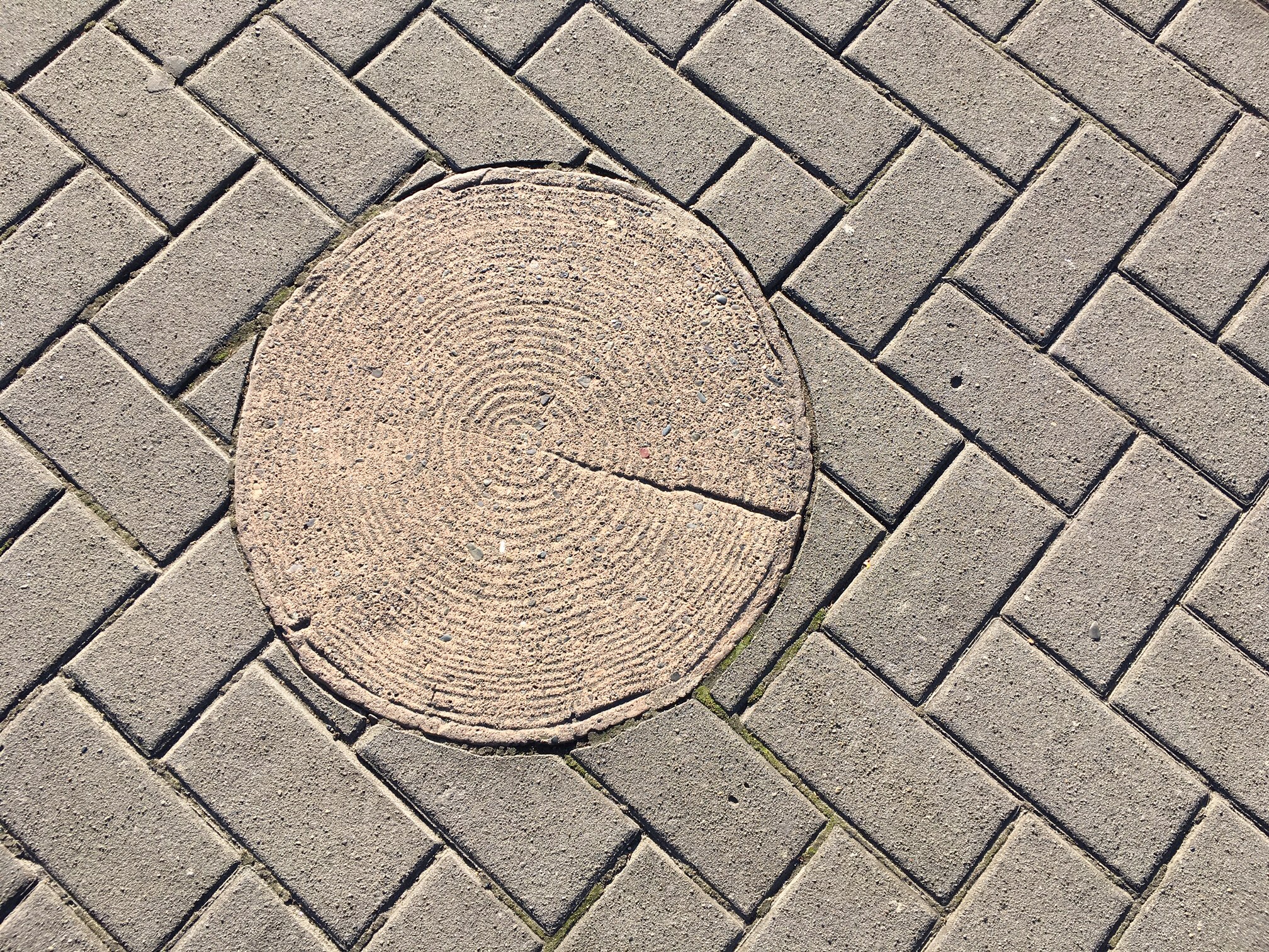 One day at the Rose Quarter Transit Center I looked down at the pavement. First I discovered sporadic concrete circles in the platform area. I realized the circles were full of circles–one circle smaller than the next with the rings getting smaller and smaller. Then it hit me: Stump tops in concrete.