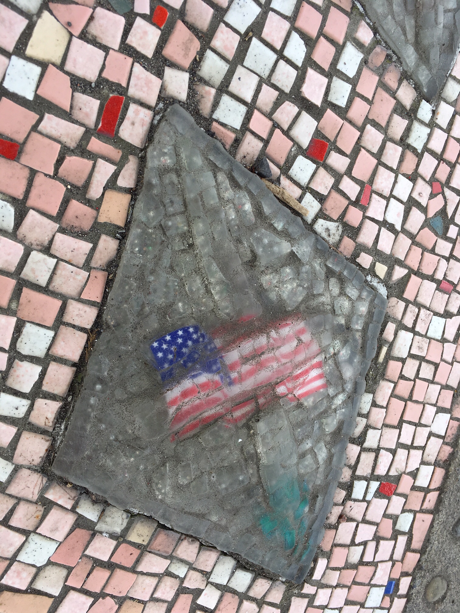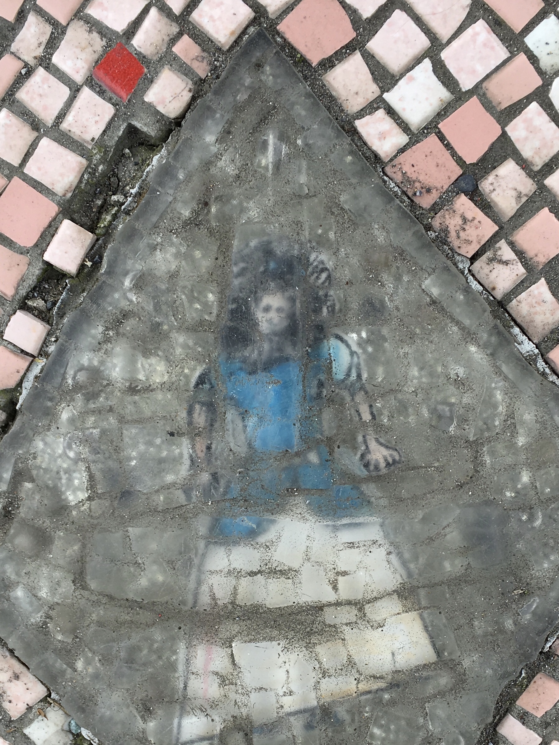 The mosaic work on the ground/platform is by Mary Taponga. I remember meeting her after trekking to her art shop, Hail Mary, that used to operate in NE around 28th Street. I was there on Election Day 2008 where we shared our anxiety about the uncertainty of that election. Her work is all over the McMenamin’s Kennedy School. On the platform there are mosaics tiles and found art objects housed in what I imagine is some kind of epoxy. The objects have the look of those soaps with something in the middle that appears as the soap wears away. In this case, these elements of the art piece have remained mostly unscathed through the years.