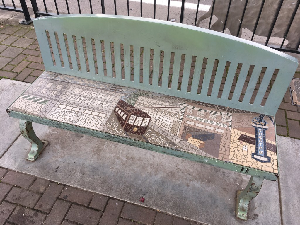 I had always assumed the benches, also known as Terrazzo seating, were created by Mary but the Trimet publication proved me wrong. The benches reproduce scenes from the good old days in tile. It amazes me that a bench at a Max stop evokes feelings of nostalgia with images of the neighborhood’s streetcar and movie theater.