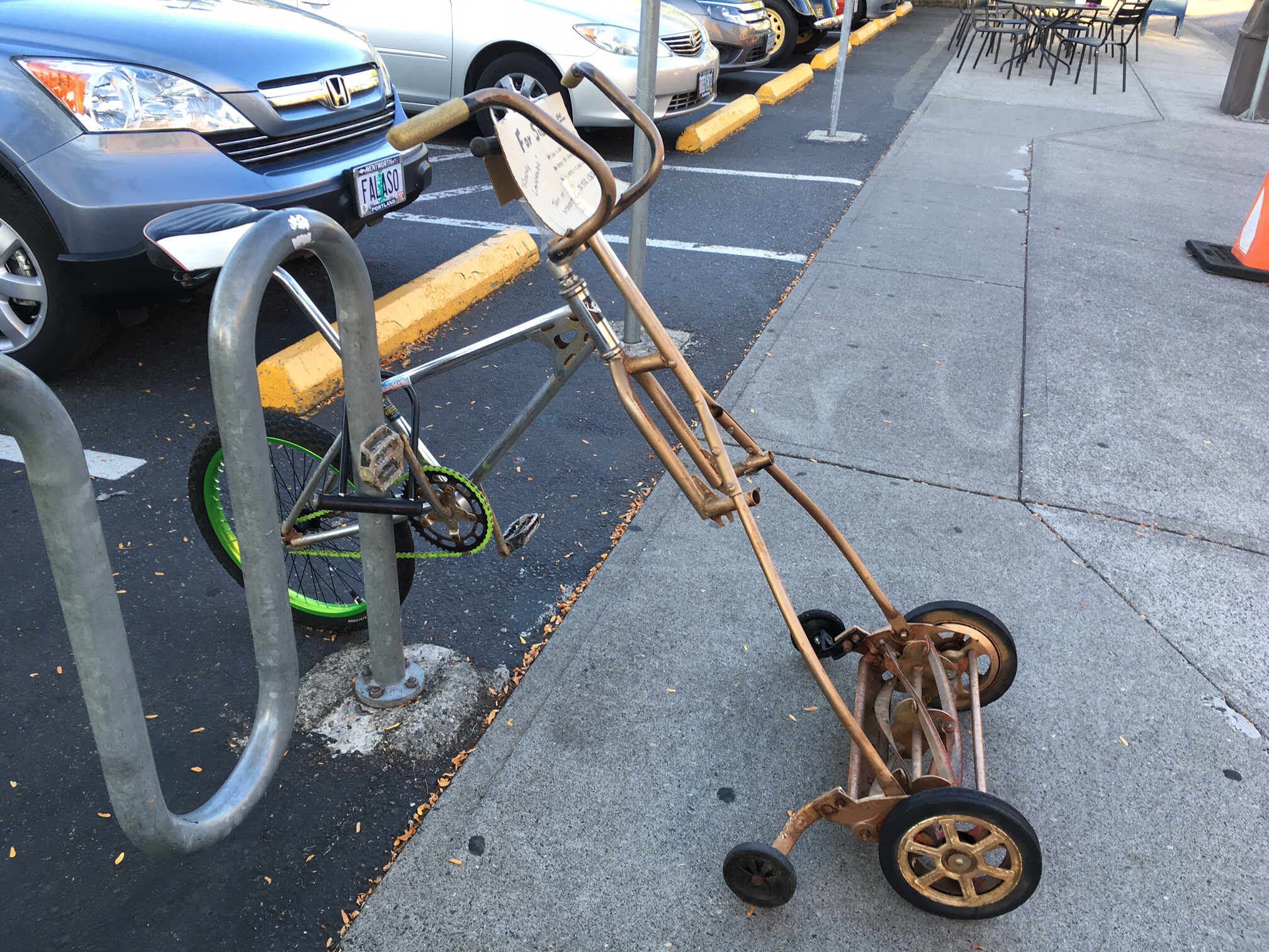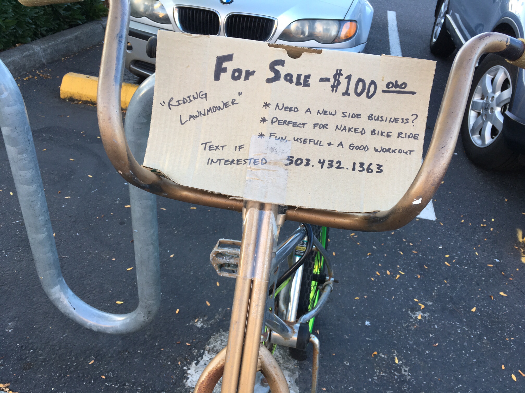 This is sure to be the strangest text you get all day but in 2016 this phone number was on a sign selling a riding lawnmower–a bike hooked up to a push mower. I’m a local blogger for the Portland Orbit and I was going to write a blurb about it. Do you remember the riding lawnmower? I saw it outside the Concordia New Seasons. Whatever happened to it? Did you sell it? Thanks and please disregard this if this phone number has changed hands.