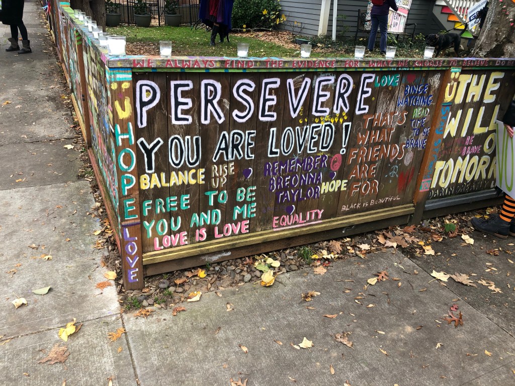 We were in the Grant Park neighborhood for a Witch Walk last October. That’s a whole other story but our mission was to impersonate witches and remind people to vote before the 2020 election. Scary stuff! The walk ended at a house where the fence has been taken over by messages of hope during the height of the pandemic. This outpouring of expression was moving. Fences don’t have to be static barriers. They can be billboards to enlighten and encourage. The homeowner allowed anyone to write a slogan or post a flyer on the fence resulting in a pastiche of positivity.
