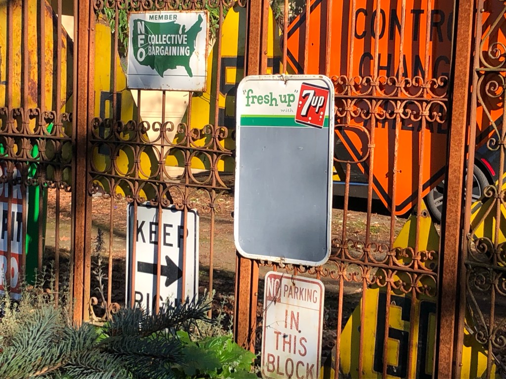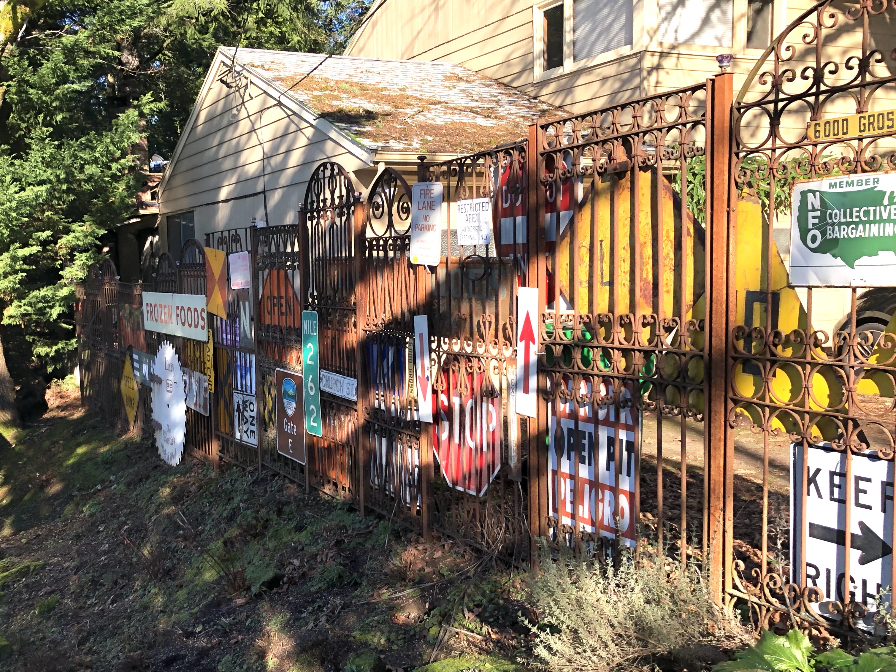 In the Markham neighborhood, this fence took on the look of a Friday’s, Applebees or Red Robin interior or even a combination of all three. It’s appealing in its visual stylishness. Signs on an iron fence have the makings of a delightful collage that recalling the back wall of an antique store. The fence breaks up the suburban monotony by wearing advertising and traffic signs like pieces of flair.