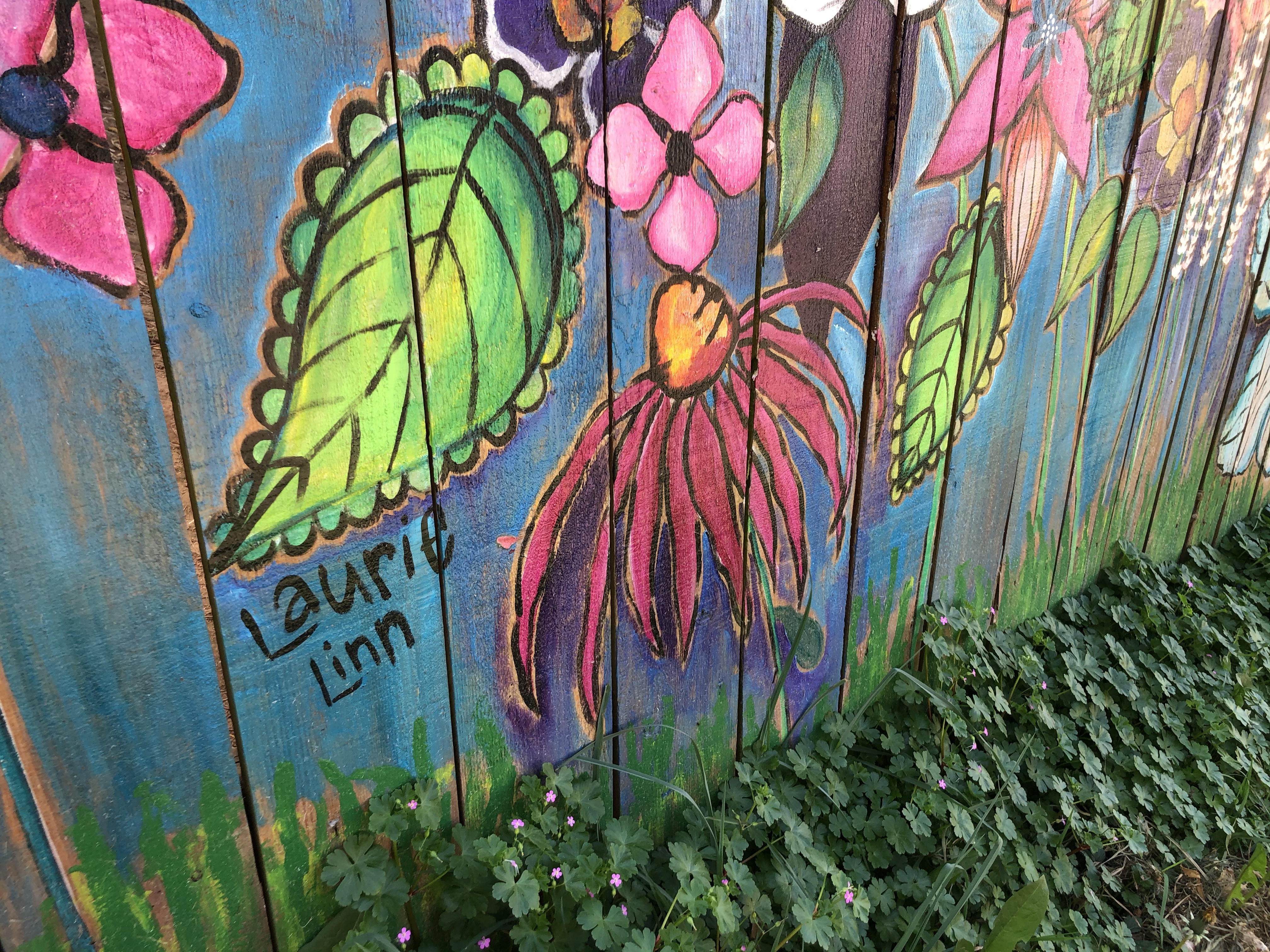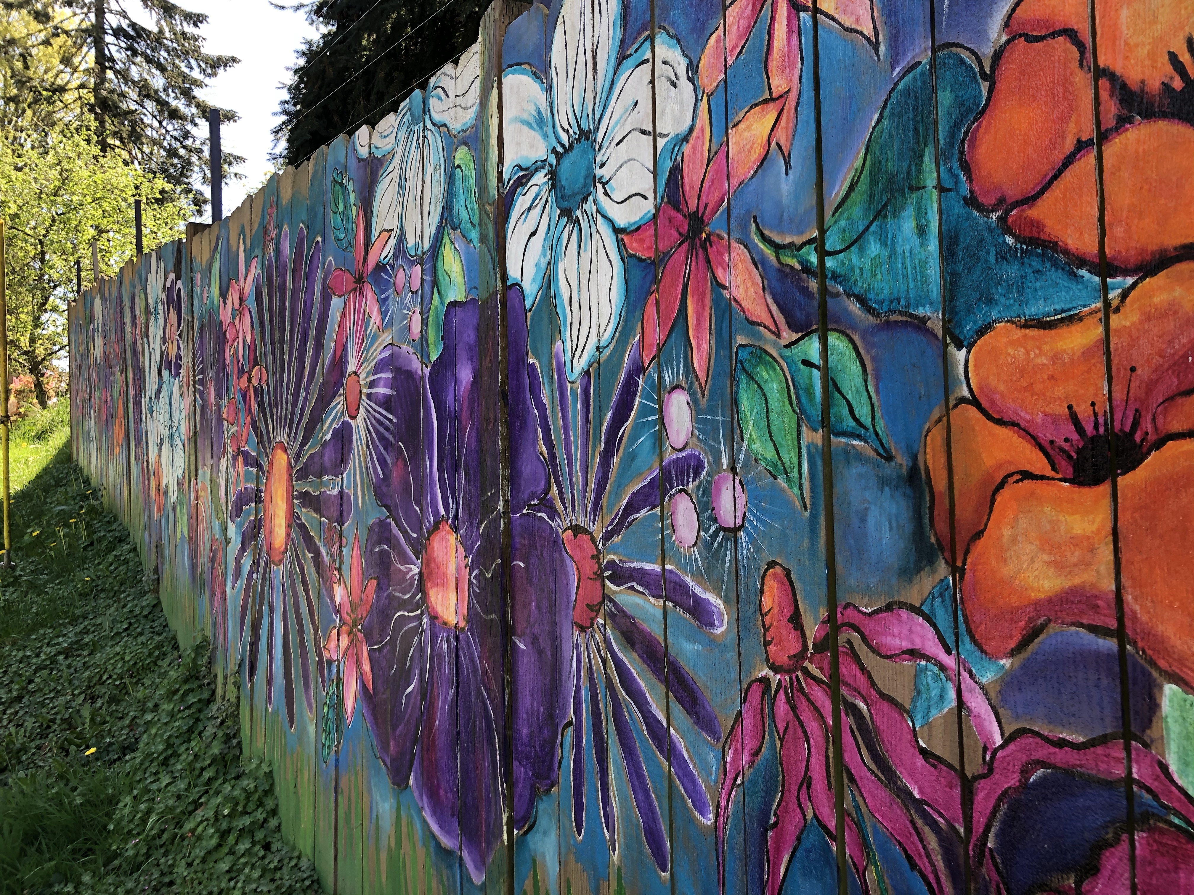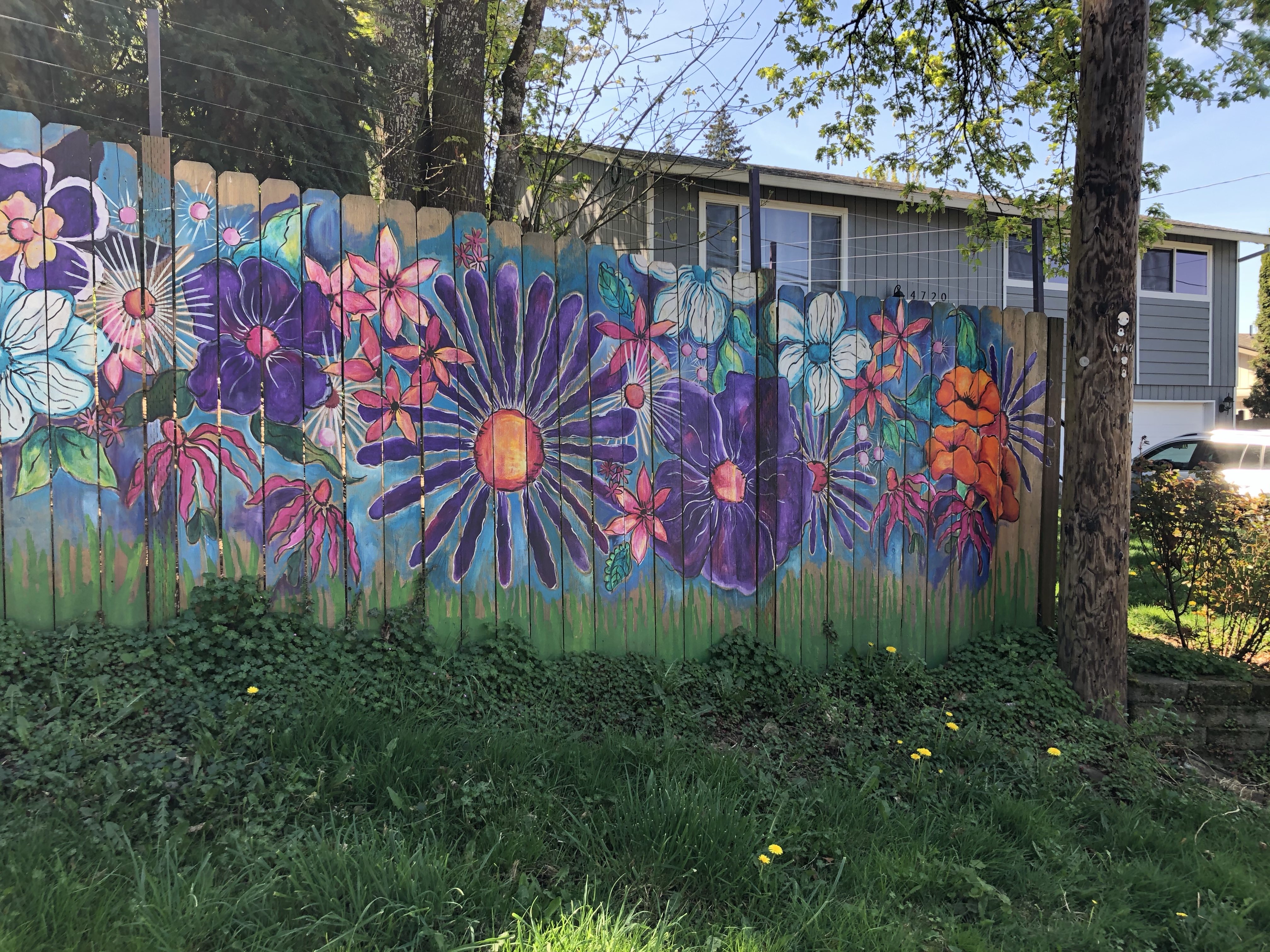 It helps to have the occasional walk about in our home turf of West Portland Park. There are sights and rare finds yet to behold. On such occasion I could not help but be struck by a garden mural painted on a fence. Great colors and recreations of flowers on a grand scale that spruced up the fence and added pizzazz to the rest of the street.