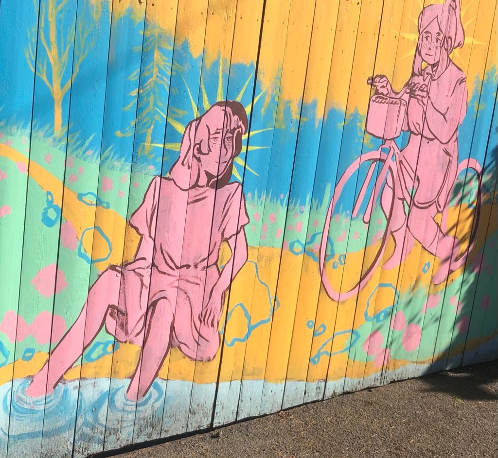 The scene would almost be serene if it wasn’t on such a busy road in the Multnomah Village neighborhood. The two panels and a koi flag felt peaceful for a moment before a car rumbled past. The art has a spray paint graffiti feel that reveals hallucinogenic forest floor landscapes. It’s a dynamic fence mural in a drive-by art gallery that doesn’t get the attention it deserves.