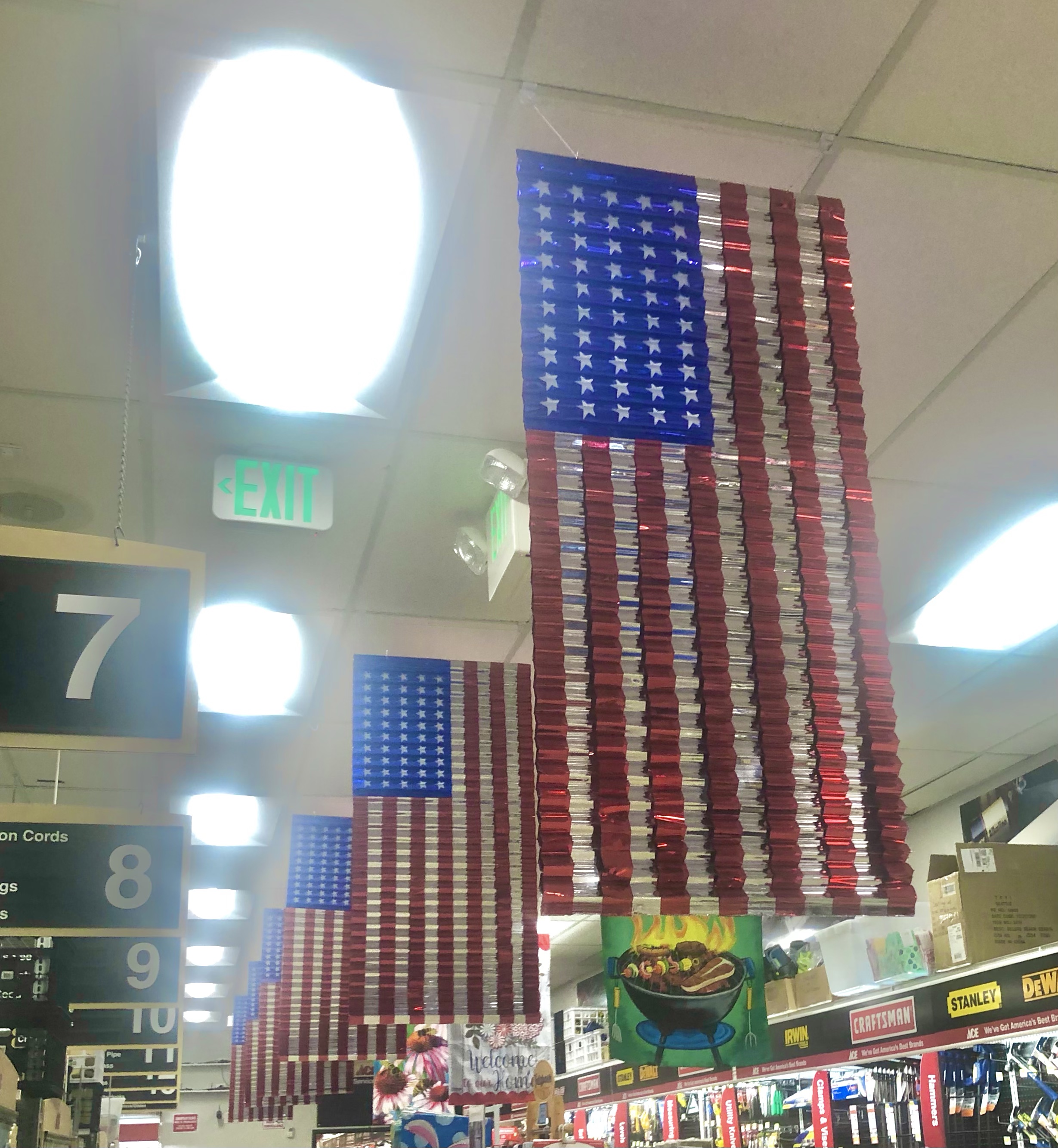 l was struck by the ruffled texture of these flags which formed a line along with aslie numbers in the Lake Oswego Ace Hardware Store. The shiny materials of these Neo-Old Glories clash with the fluorescent lighting. They create the kind of effect that had me proudly marching through a store as if I were promenading into a military ball.