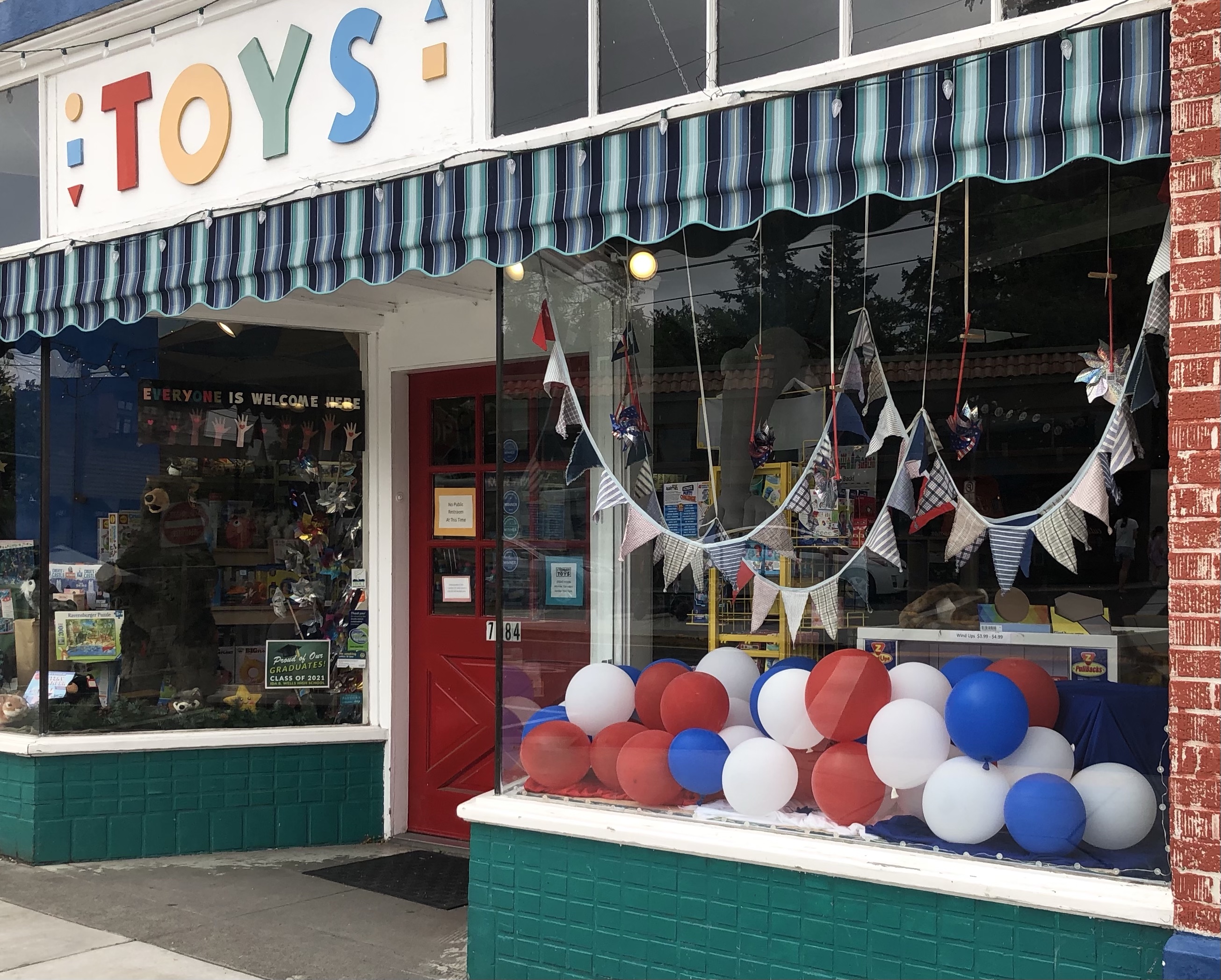The Multnomah Village toy store gets seasonally appropriate with a window display celebrating Independence Day. There are flag themed pinwheels, balloons of the appropriate trio of colors and those triangle-flag-streamer things suspended from the ceiling. While I’d hope to see a flag blowing in a fake breeze created by a fan set at a medium speed, I’ll take what I can get.