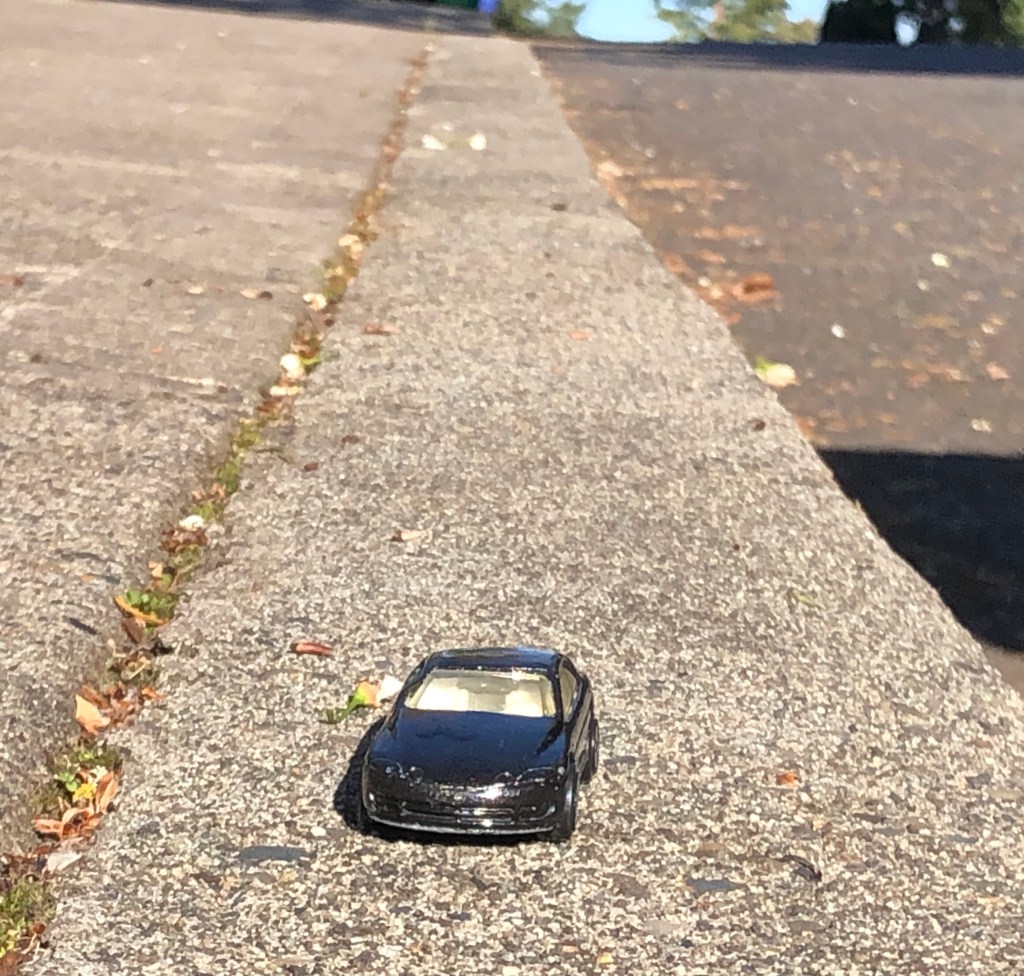 A lone car looks, well, lonely as if it did it’s best just to get itself parked and abandoned on top of the curb. It shines in the sun as if arriving fresh from the car wash.