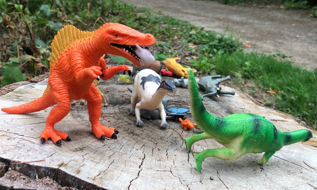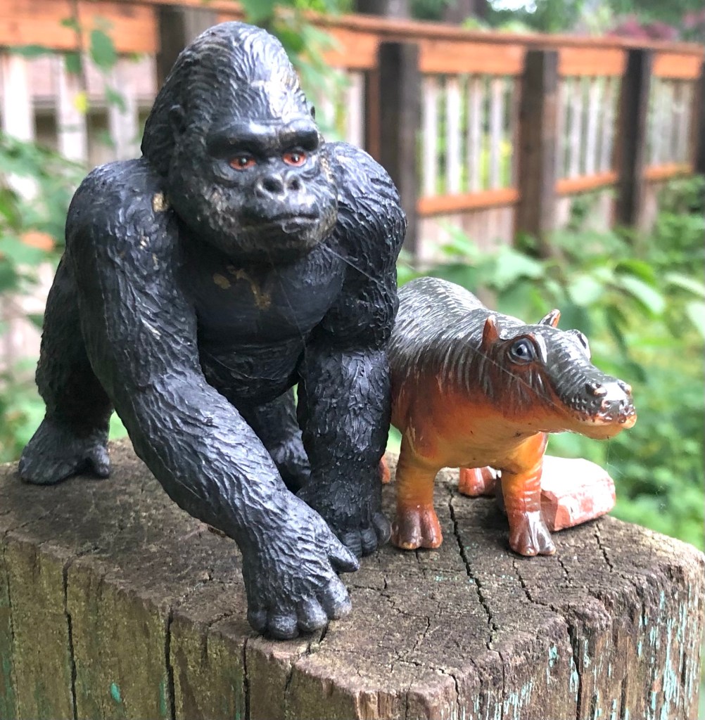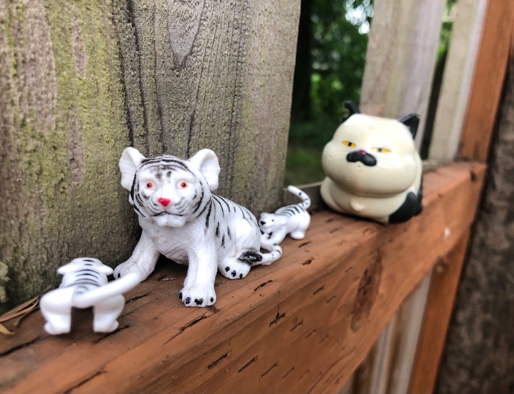 These photos offer a misconception about sad toys. Some rise above sadness. New, unblemished toys, positioned in the right way, appear majestic. I stumbled upon these scenes in various locations along a trail that leads to the Multnomah Village neighborhood. In some of the scenarios you might consider a dinosaur on its side to be a sad sight and there are toys getting eaten by other toys, but these dioramas remain undisturbed. They elevate any possible sad toy status to a level of majesty and they look good doing it.