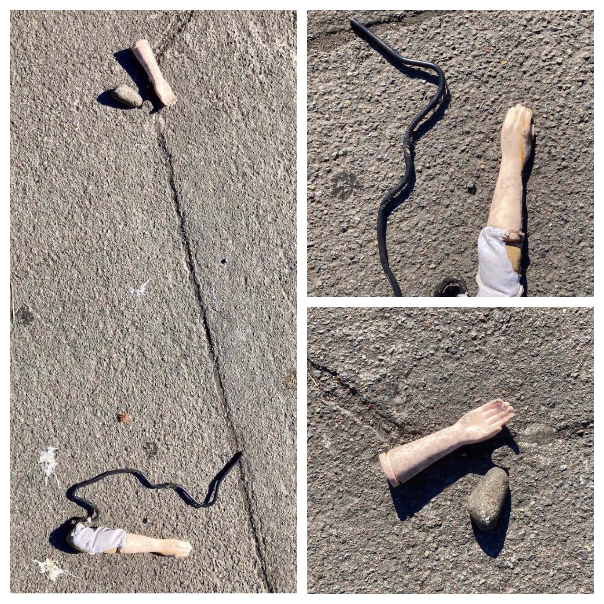 Our North Portland correspondent Graham Marks spotted a sad toy in pieces in the Kenton neighborhood. It’s hard to imagine the scene but it had me considering a miniature bomb blowing up a figurine. We’re left with pieces mostly limbs and wire. With so little left, the imagination has to piece together what happened.