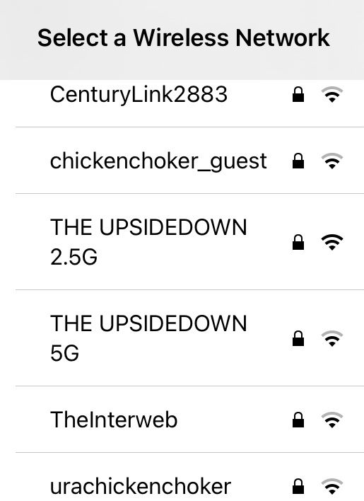 Finding network names is as easy as pressing the settings button on my phone then hitting the wi-fi button. A list pops up with names that are sometimes memorable. Other namers use their own names or leave the network naming to a default setting. Looking up network names is a fun game to hunt down goofily named networks, the creative ones and the names that are downright offensive.