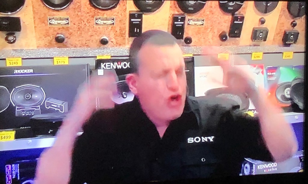 Rumor and probably research would reveal this guy to be related to Tom Peterson–the patron saint of local advertising appearances. Heck even Kurt Cobain sported a Tom Peterson watch and if this Outrageous Audio guy had a watch I’d get one. As far as I know he doesn’t blast his name out in advertising. There no time. He’s too busy pushing the product in an outlandish way. It’s all crazy deals smothered in crazy sauce. I have to say–it works. The commercials are never dull and while it doesn’t feel quiet like a mental breakdown in progress, it’s close. That’s the fun.