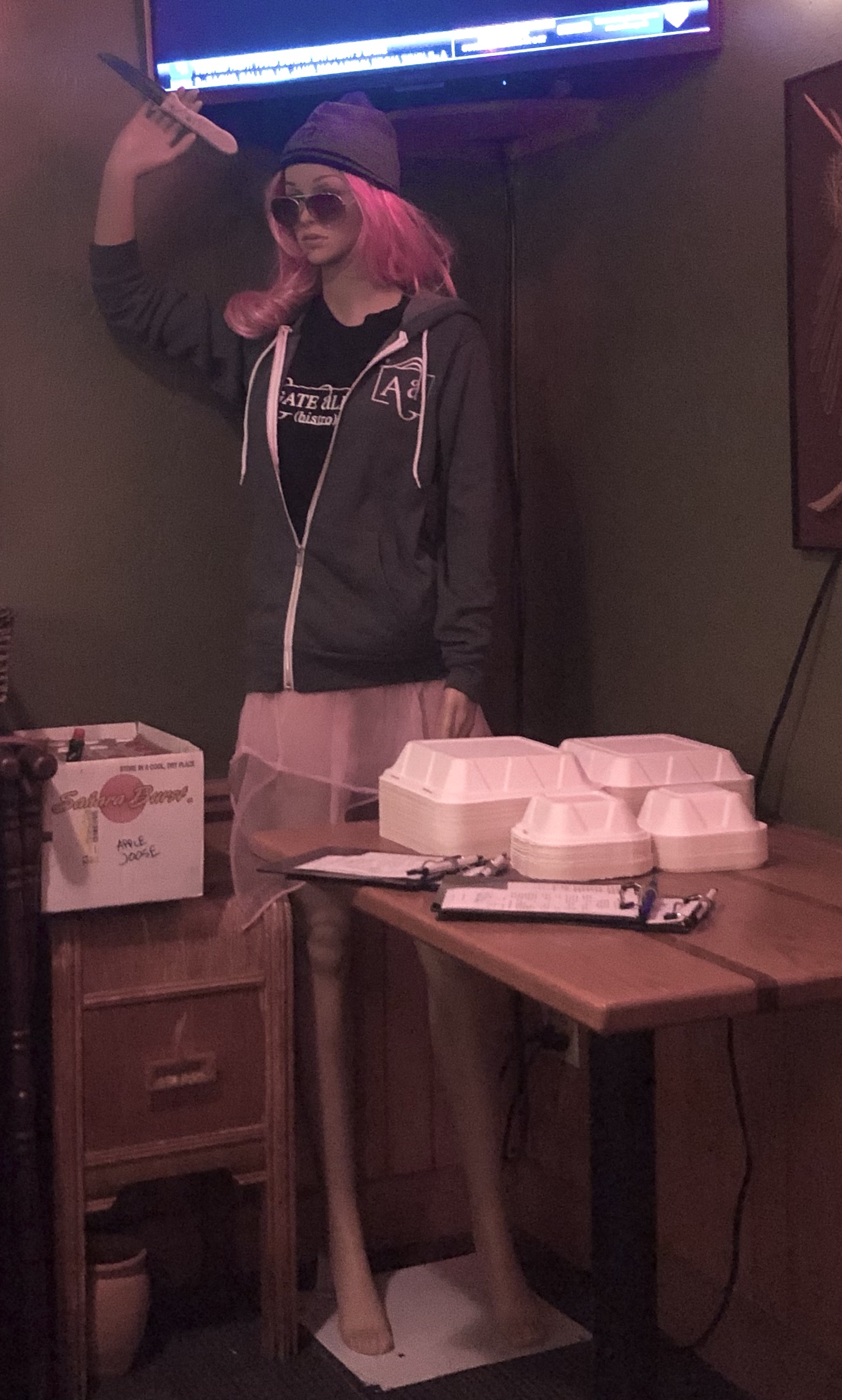 It took a while, then, in a restaurant close to the stadium, I realized there was a mannequin in the corner. She’d been watching the whole time. An added bonus: She’s got a knife! The dark corner, the hat, hoodie, shades and a hand, barely able to clutch that blade–all fantastic!! Especially for an Italian place that was running a half off special on bottles of wine.