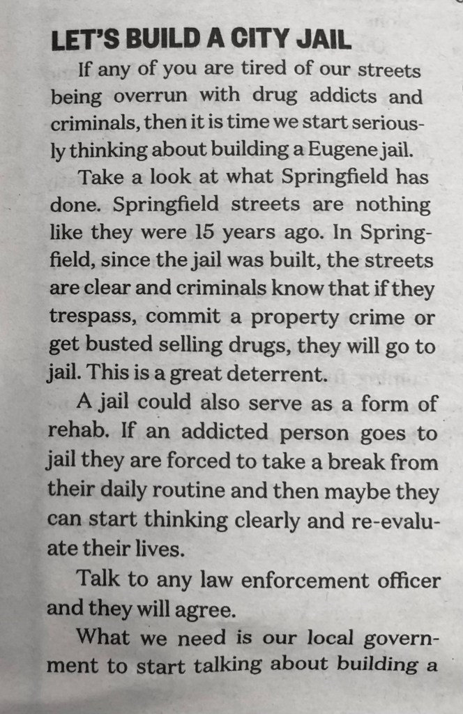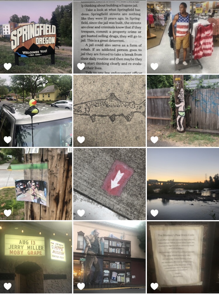 My focus here is mostly on Eugene but I have to point out what anyone from the area knows, it’s hard not to include the neighboring town of Springfield. I was surprised to learn I was staying in Springfield just over the border from the edge of the University of Oregon campus. The police and fire departments use the two town’s names so it’s kind of a metropolitan area now. This post includes both areas despite leaving Springfield out of the title. Not as much rhymes with Springfield. I did spend the majority of my time in a small section of Eugene spotting numerous examples of my favorite fixations, pole art, arrows, signs, murals, museums, letters to the editors and more. I only scratched the surface of these categories. More examples of these topics would have been discovered had I spent more time in the area.