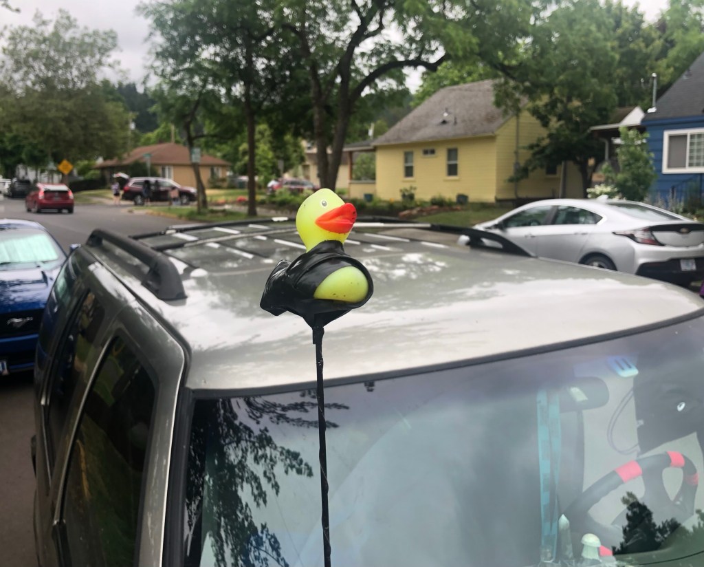 Despite their inability to be photographed by my iPhone camera, I can never get enough of antenna toppers. I even had a quick chat with the owner of this one. She laughed as I snapped away, hoping for some focus. The duck imagery never ends at a college with a duck mascot. Ducks everywhere! Souvenirs, t-shirts, silhouetted on athletic department buildings; webbed duck prints even appear in crosswalks. This duck topper made perfect sense. I was equally amused by the black duct tape that fastened this tub toy topper to the antenna.