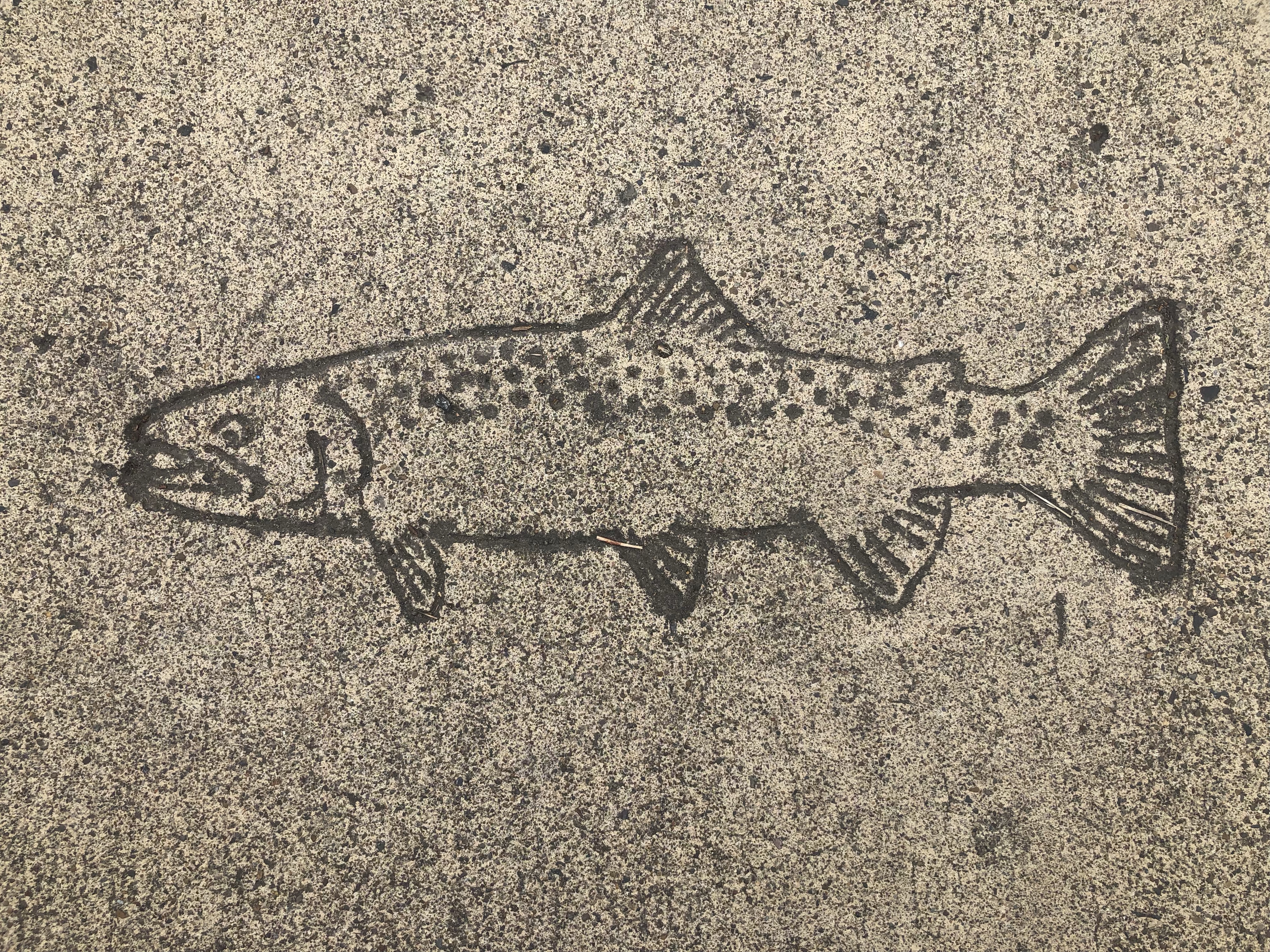 This sidewalk stamp is part of the campaign to remind and/or educate people that what they put down the drain may head straight back to the local rivers. I was impressed, maybe that’s a stretch of a pun, by the details left by this impression. The salmon practically appears to be flopping off the sidewalk.