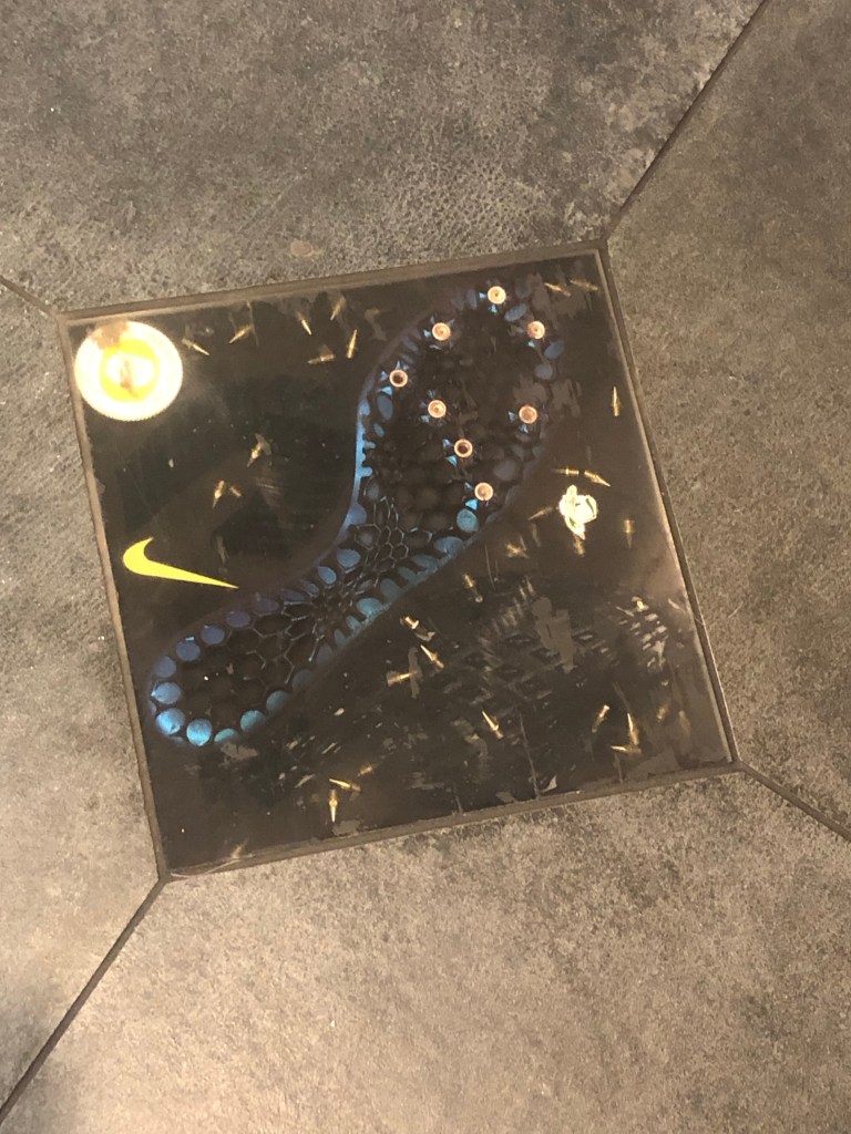 I’m always struck by bathrooms that are stylishly decorated with murals and the soles of track shoes planted into the floor. This was the only stadium bathroom I used but I couldn’t resist taking pictures. It’s not a good look to be snapping away in this type of facility but the art was too bold.
