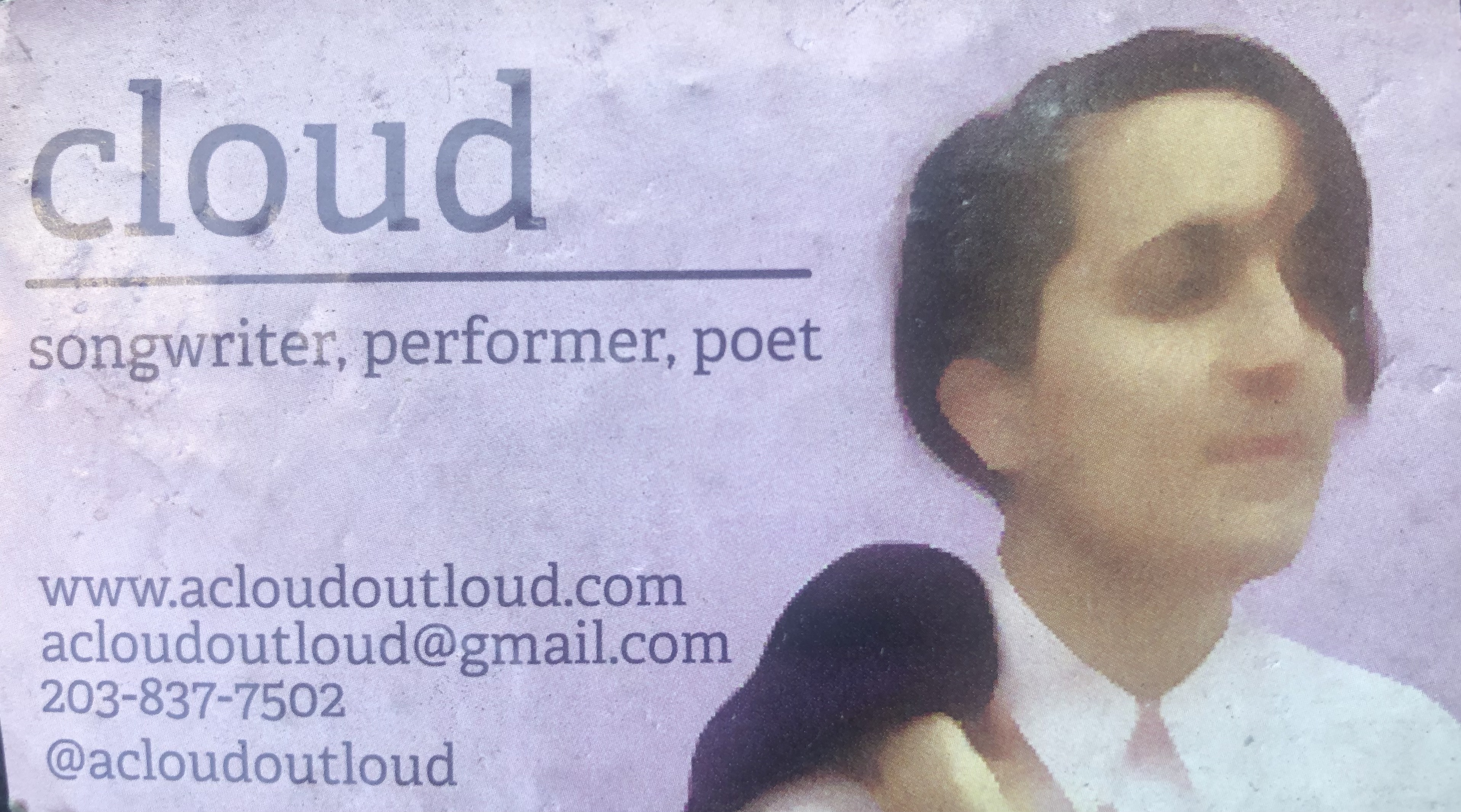 Most nights my job had me waiting outside the gate waiting to take on one of my duties. Cloud set up her cube PA system and guitar and played music with a bucket percussionist. The highlight to her groves that rang in my ears was a guy in the street who one night doing an improvisational scat directing people to Cloud’s tip jar. I learned more about Cloud through a business card that was left behind. Heck, us poets have to stick together.