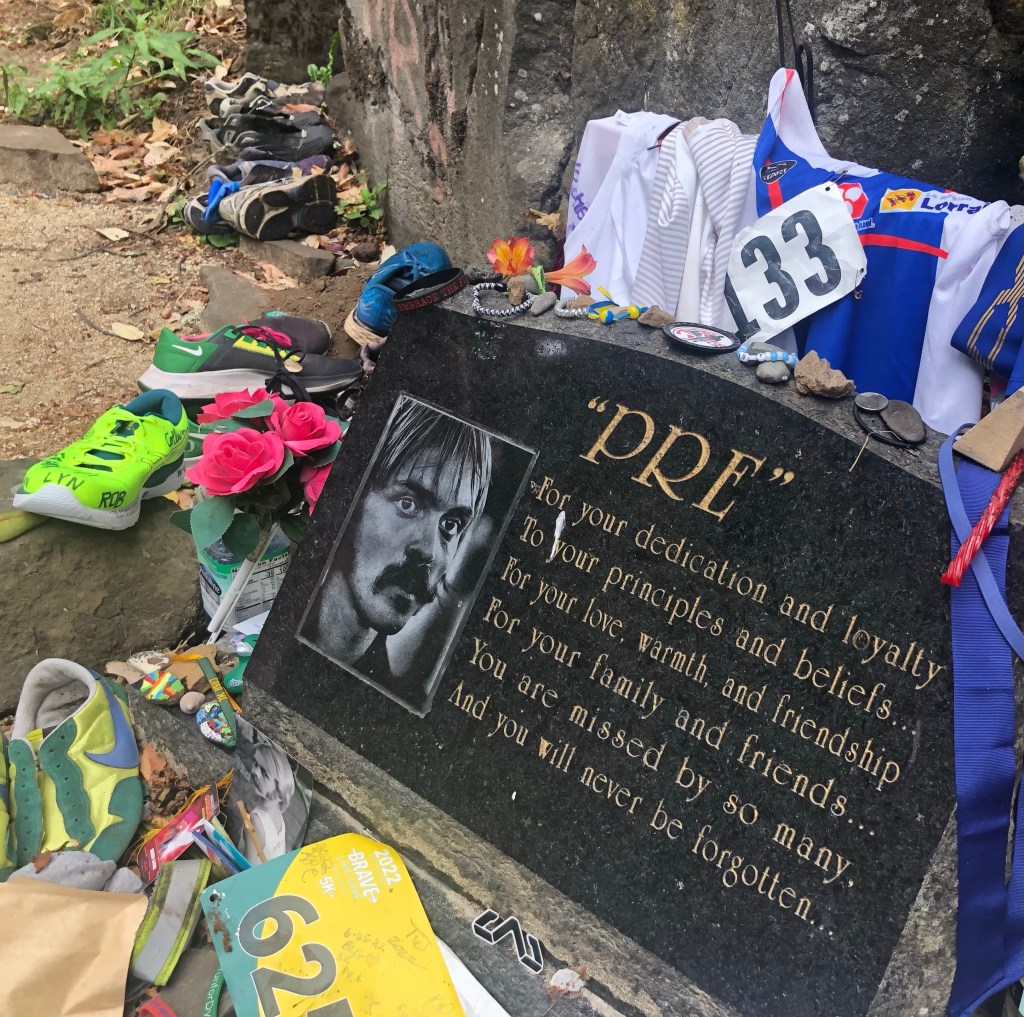 I needed to make the pilgrimage to Pre’s Rock if only to tell myself I did more than just work in Eugene. It was closer than I realized and easier to find with sign markers with arrows pointing the way. I followed the winding road that led to the spot of Prefontaine’s doom. The roadside memorial, with all the track gear that’s been left behind, struck a chord of loss and shared grief. I had to shoot around the other visitor feeling bad that I really wanted to take it in alone.