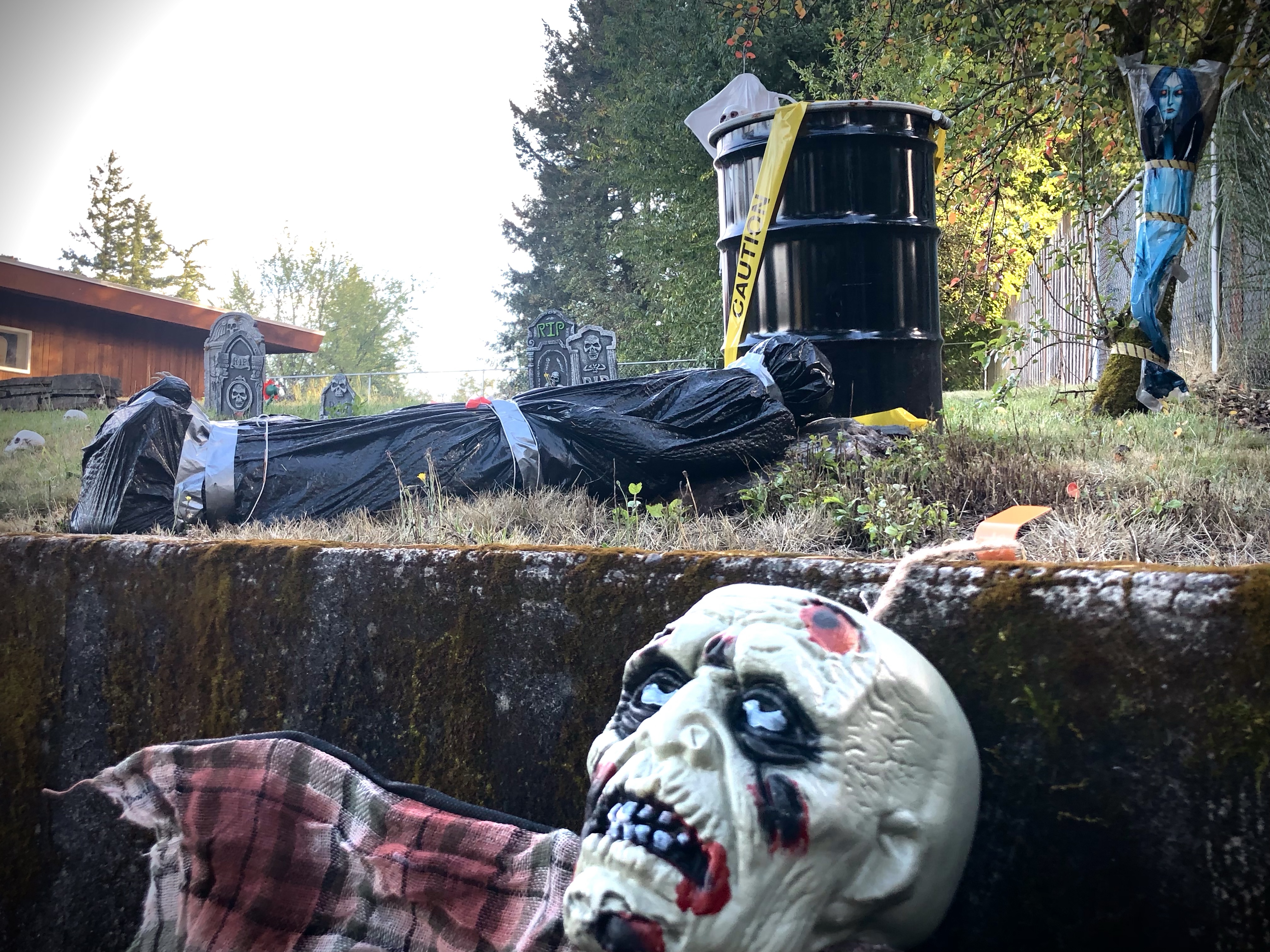 It’s a gruesome sight. I catch it every year and it keeps getting creepier by the minute–that’s every minute I spend time thinking about it. What’s in the barrel? My first thought was nuclear sludge. I spent more time considering. A body being dissolved in acid? Do you see where this is going? That’s just one element of this scene. There’s a body wrapped in duct tape and thick black plastic and a sinister portrait while some mutant attempts to photo bomb my efforts to take a picture.