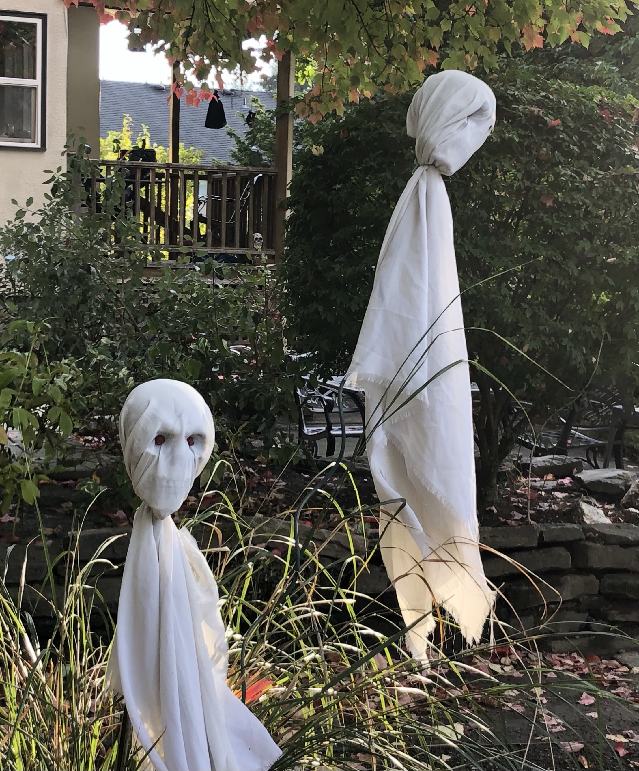 I can’t resist enjoying visions of hanging ghosts despite how redundant they seem. These spirits are already dead. I get that the purpose of their suspended animation is decoration. Ghosts are a cog in the Halloween machinery and it would be a grimmer experience without them.