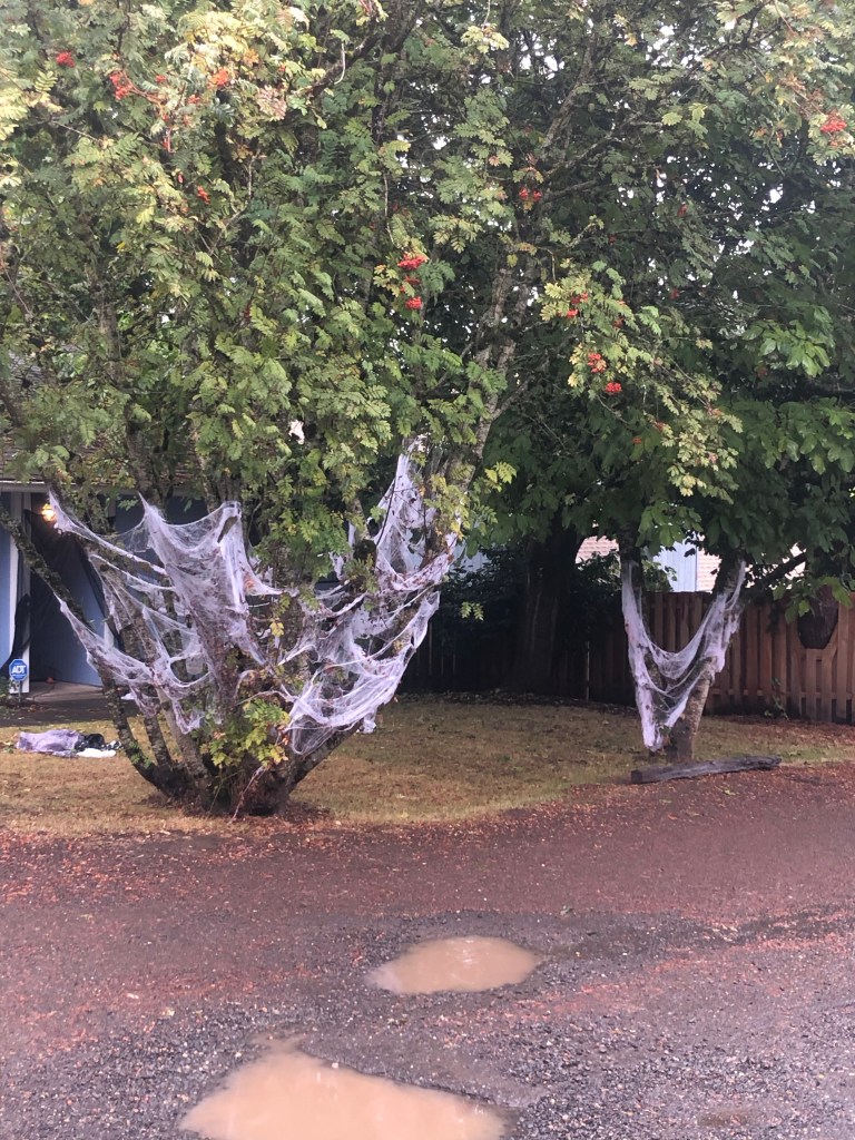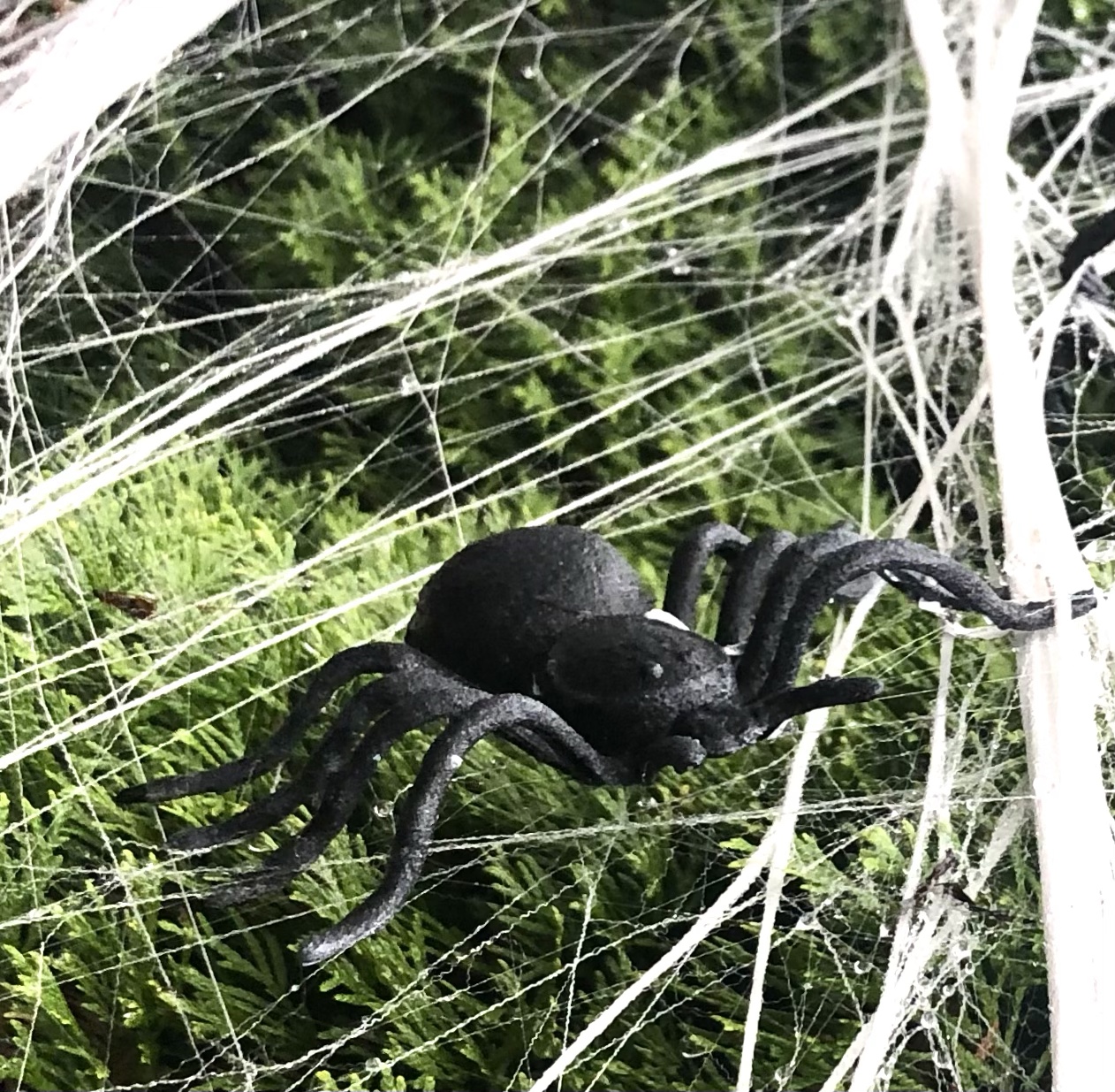 Webbing is decorative. I’ll give it that but is it ever realistic? It may not matter how many plastic spiders you put in it. This web impressed me because it stretched the length of a long row of tall bushes. I wouldn’t have expected this kind of effort.