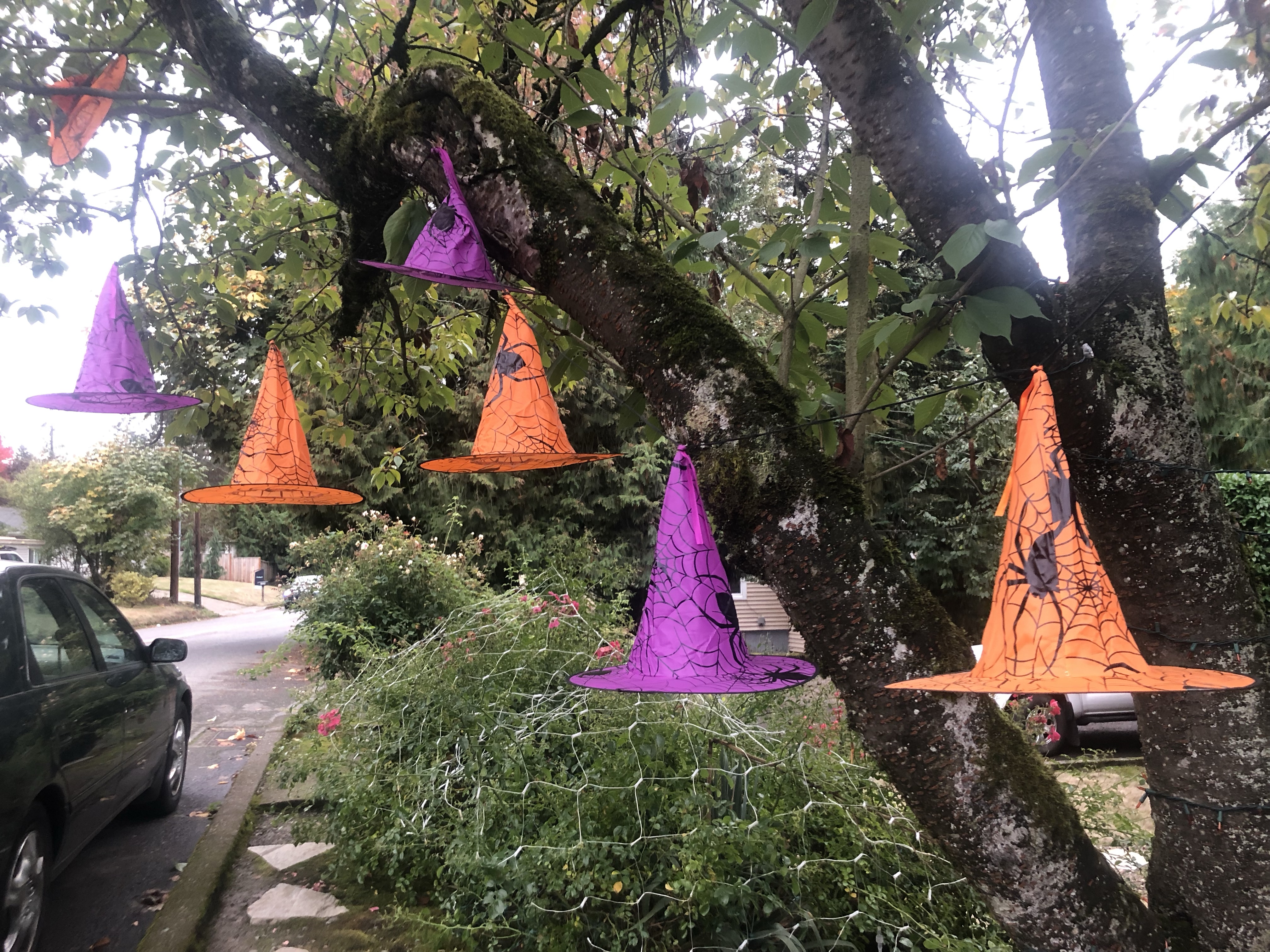 Colorful witch hats hanging in a tree caught my eye and my imagination as soon as I noticed them weeks ago. Blinking lights surround purple and orange–a color too close to traffic cones, in a unique display which leaves me to wonder where the witches are but the mystery is part of how this hanging stuff from a tree display goes to the next level.