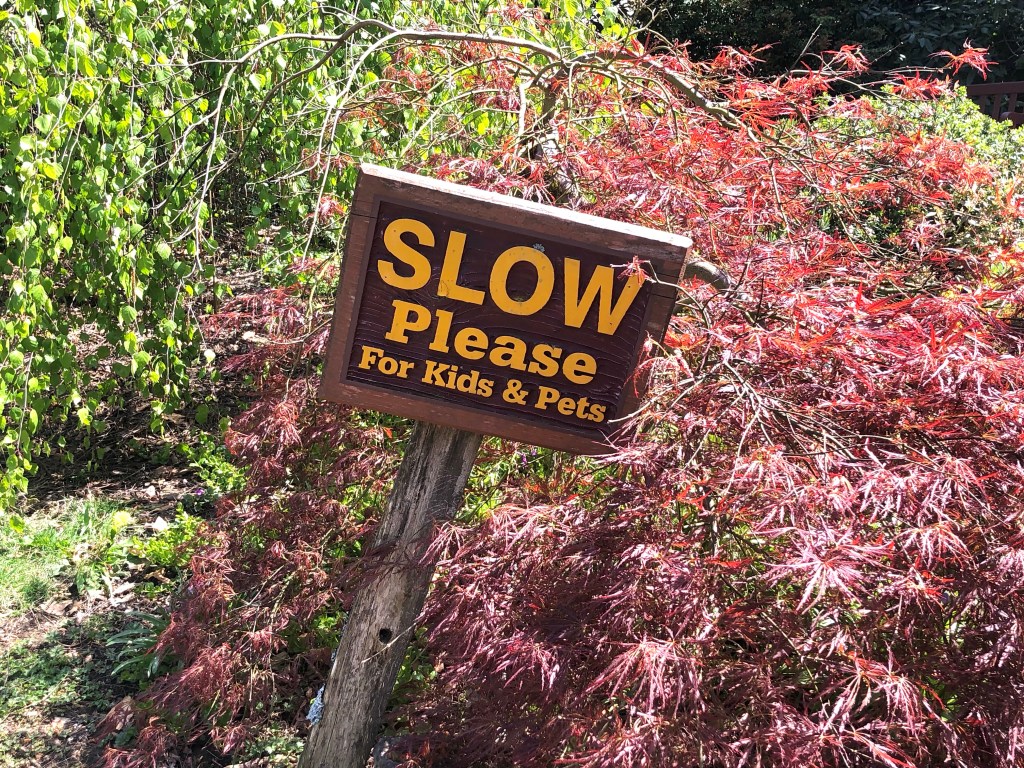 There’s something that seems official about a sign framed in wood and planted in the ground. The slow word in all caps makes the message serious. Slow is bold, manners are included and once again it sticks up for children and animals. Be slow so the young ones and their pets can prosper.