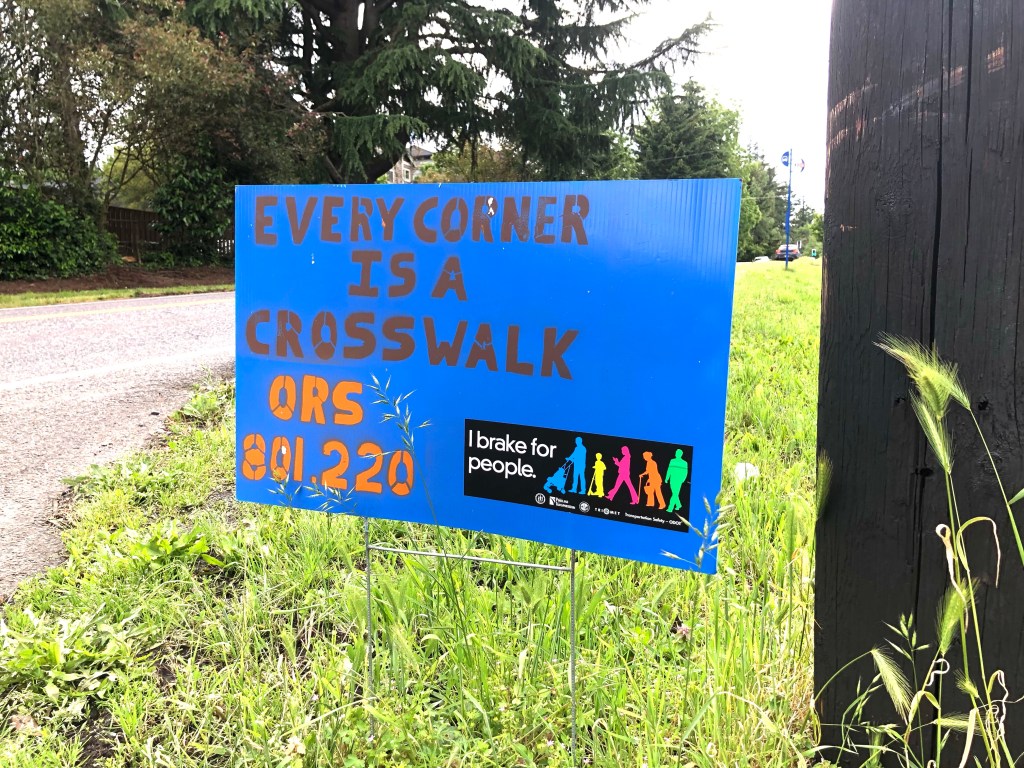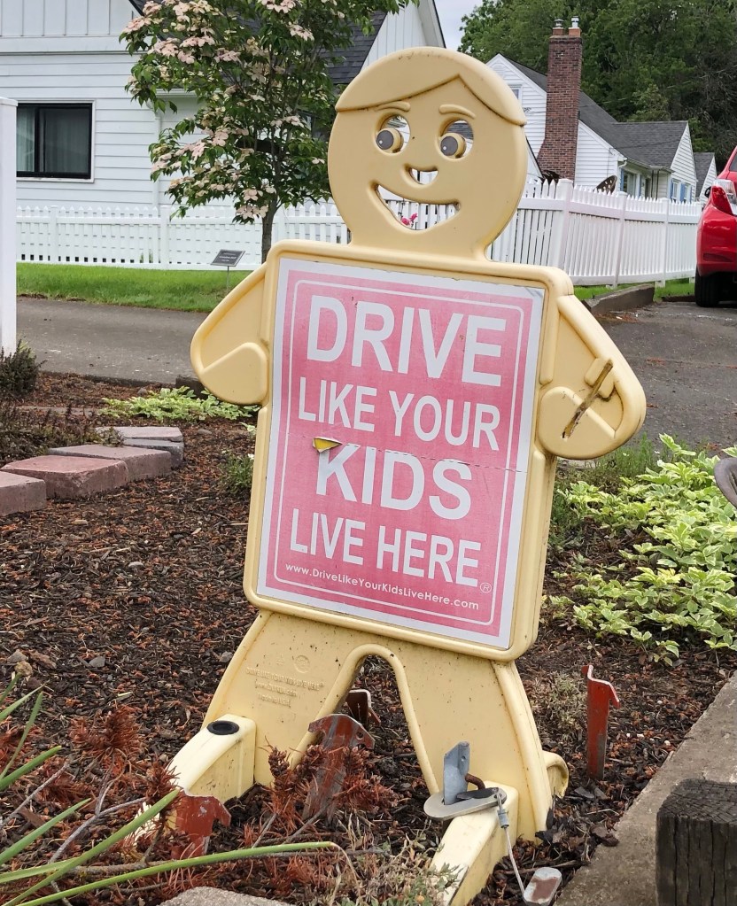 The theme continues. Cars are getting in the way of kid’s and pet’s fun. This reminder in West Portland Park, shows a child, helmeted for safety, chasing after an off leash dog. People driving fast, after blazing past this sign, are risking creating a scene straight out of Fast and Furious 6.