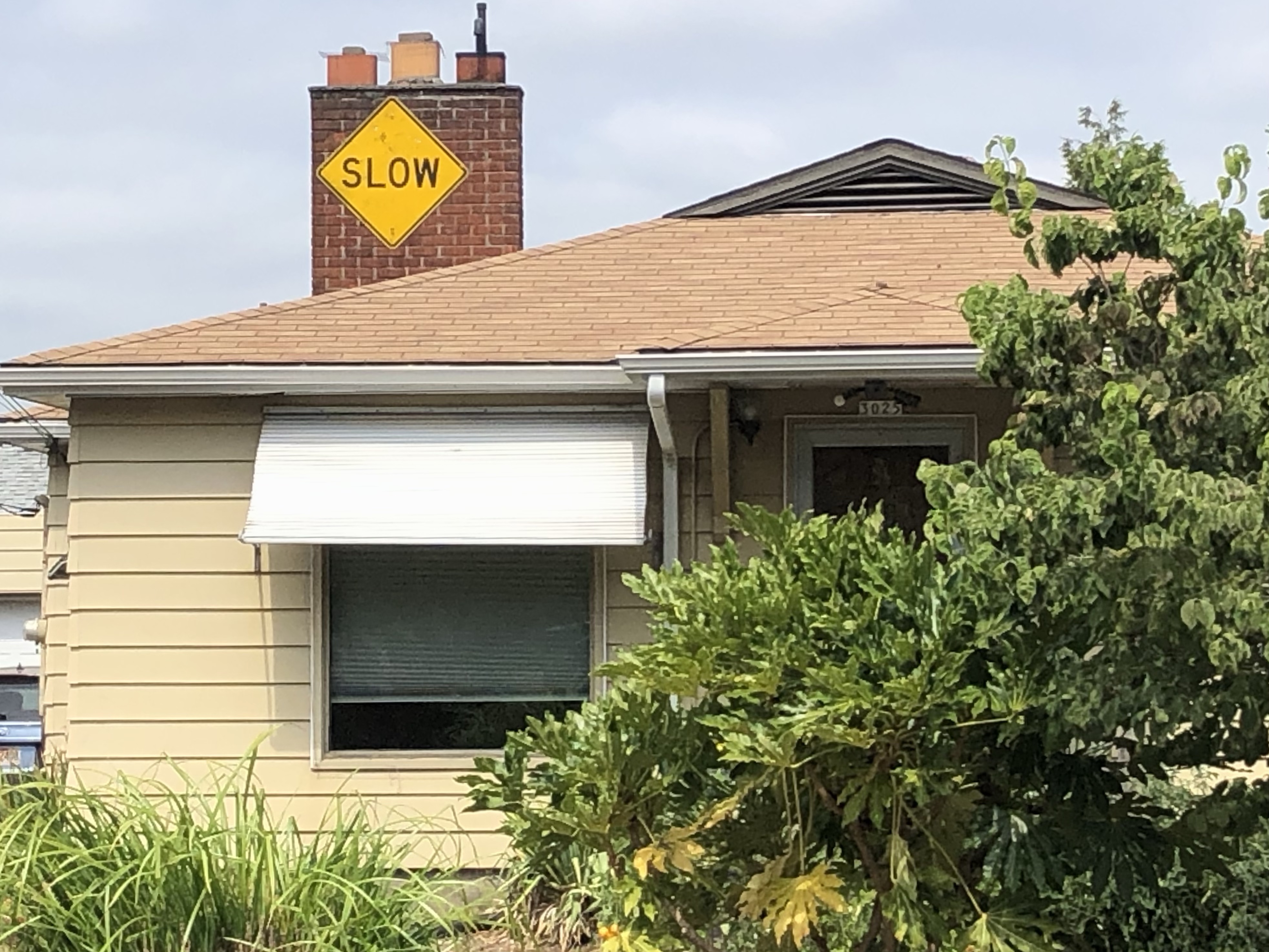 This sign seems to serve as a beacon in the Kenton neighborhood. I was enthralled as I caught sight of it while driving down the street. The official slow sign is in such a humorous location it practically begs to be heeded. It had me slowing then stopping to get a photo.