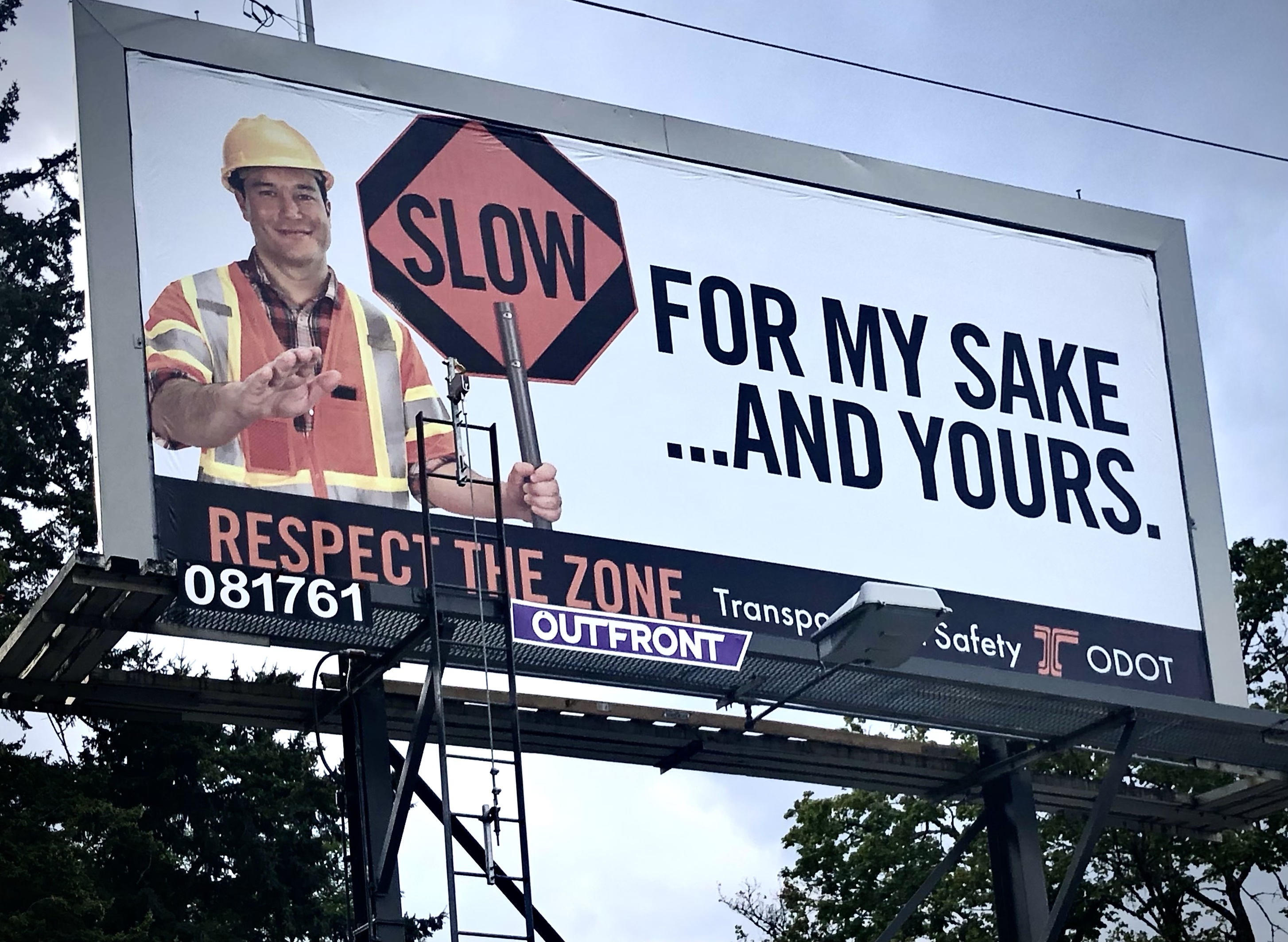 This billboard on Barbur Boulevard in SW made the slow message hard to miss. It also seemed to be shouting at me. A nice enough guy is offering a common sense message. Don’t speed in construction zones. You might run over the poor guy in this billboard. I could imagine his hard hat and slow sign flying as he tumbles along the highway. This all depends on whether this is an actual construction worker and not an actor/regular guy billboard model.