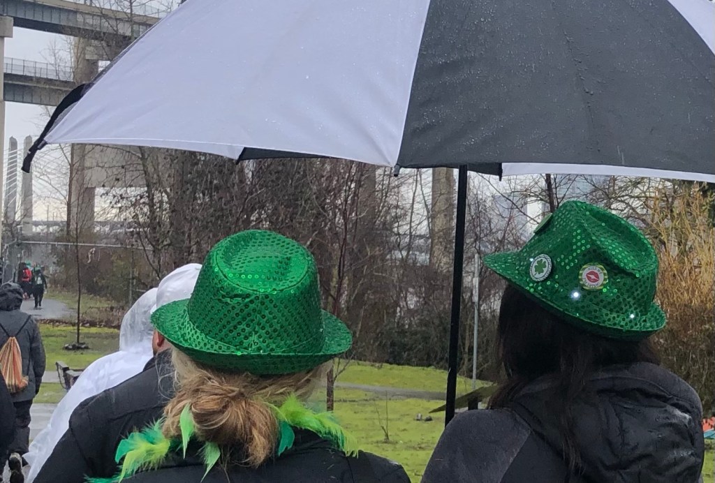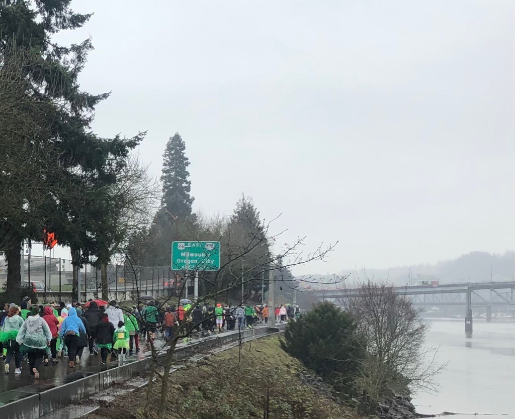 I’m sure there were real Leprechauns in attendance monitoring the Shamrock Run event. They may have been hiding behind the graffiti strewn pilings under the Steel Bridge as we made our way towards the Tilikum Crossing Bridge. We took the path of least resistance–a brisk walk. The event included competitive running events like a 5K and a half marathon with the stride walk. We took the slower option which allowed us a chance to enjoy our surroundings.