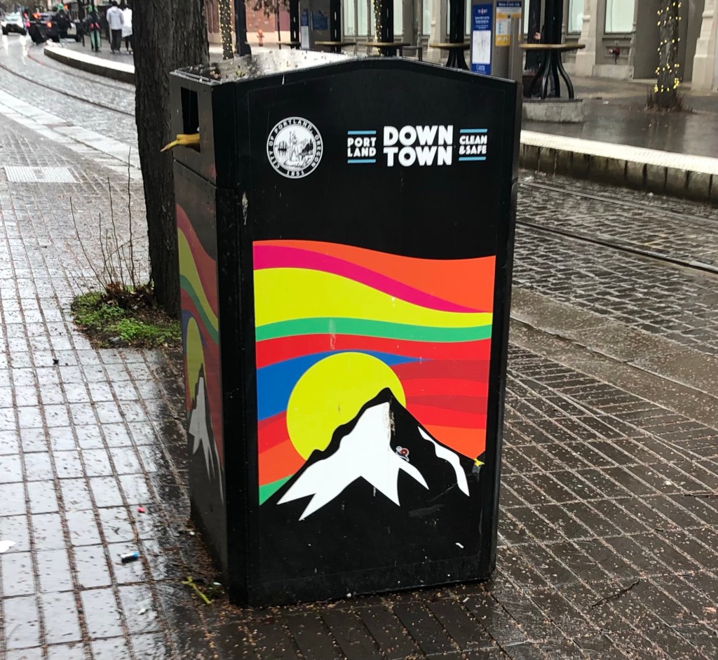 I’m all for trash cans getting decorated for better visibility. These designs are fun and colorful. This one, as you can see, features the tip of the mountain surrounded by an abstract sky, as if the good Lord dropped something, a paint brush perhaps. But the mountain looks good, it’s recognizable. It follows my new adage about keeping it simple so we can keep admiring the mountain.