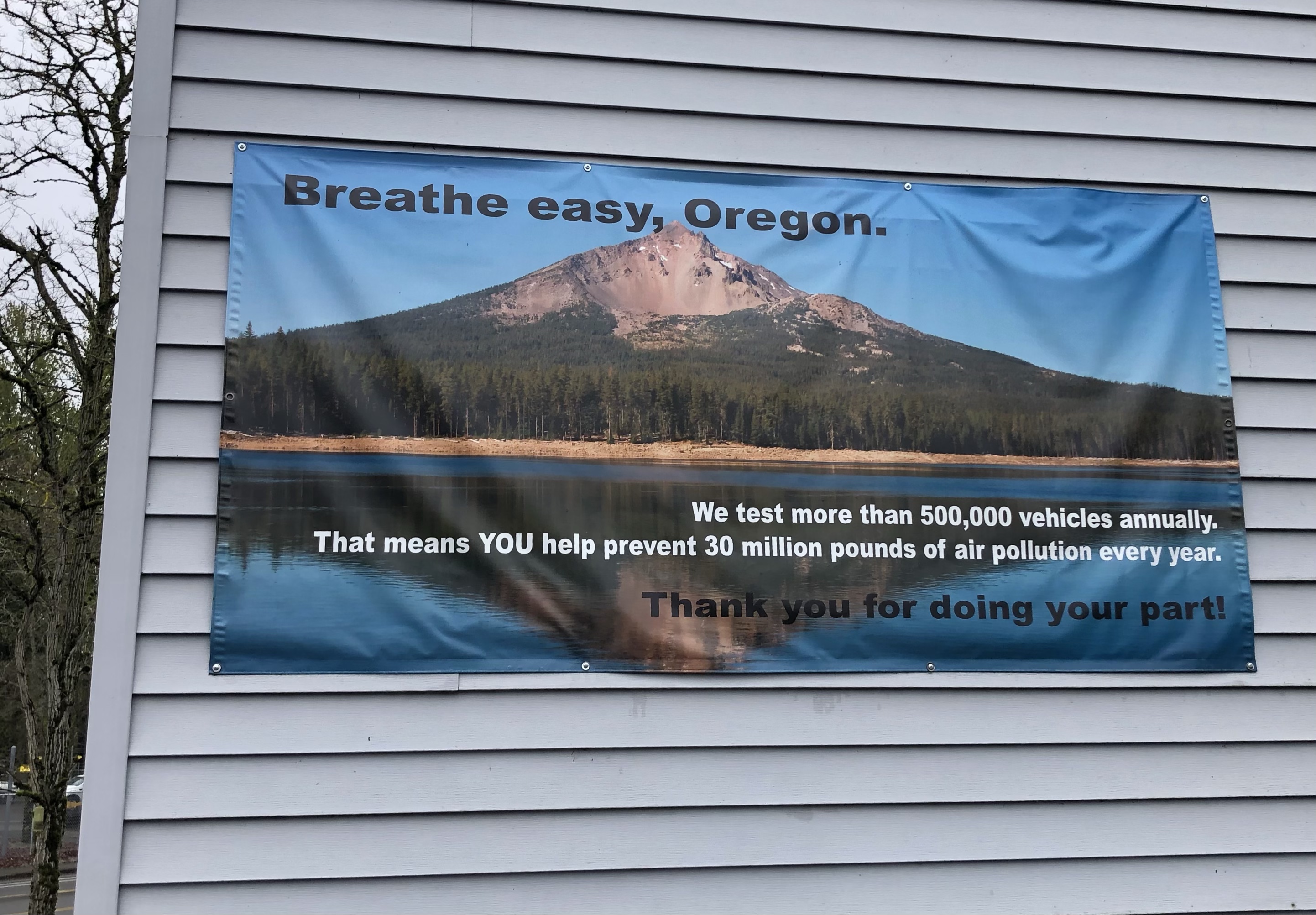 In the Sunderland neighborhood, the DEQ facility did it’s best to hang a banner with an image of Mt. Hood on it to remind Oregonians that all the hassle of going to the DEQ results in cleaner air so that you might even be able to see the mountain better. It’s especially nice to see the mountain, as the banner depicts it, on the one day of the year when almost all the snow has melted.