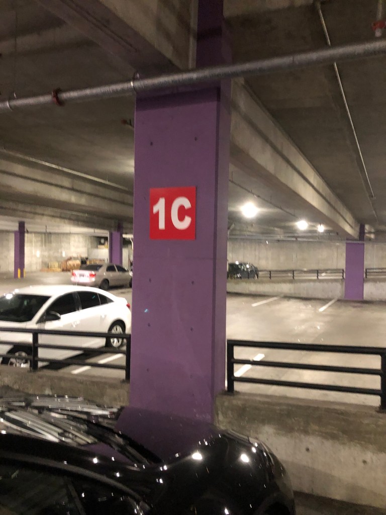Purple parking garage column, Hillsboro.