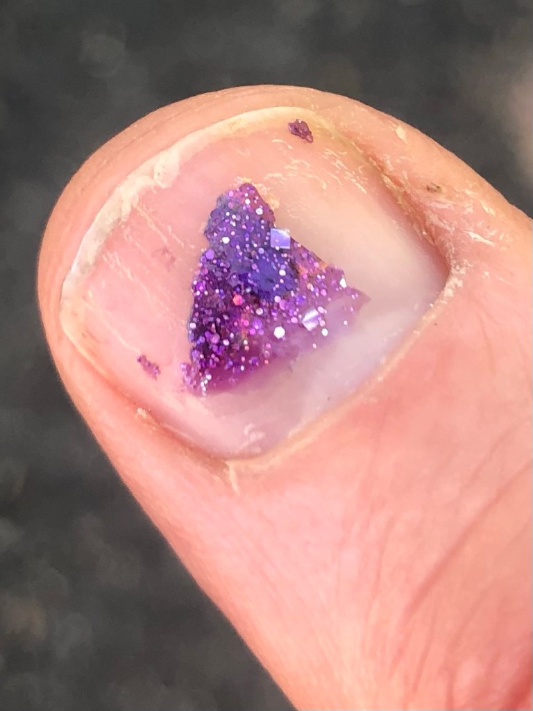 Purple chipped nail polish.