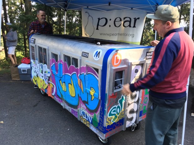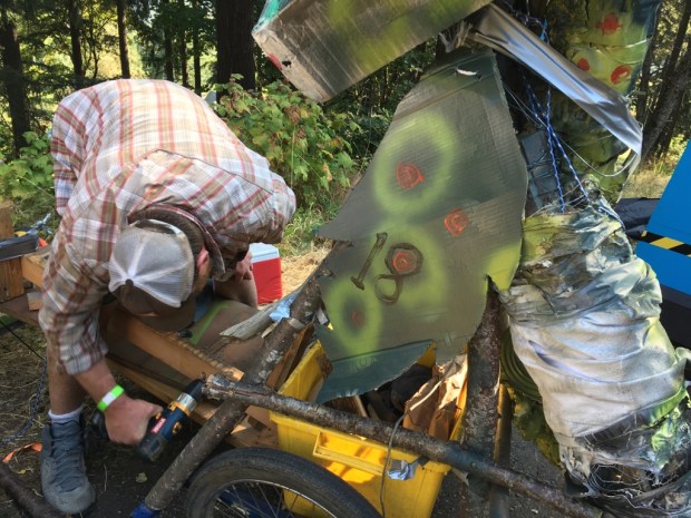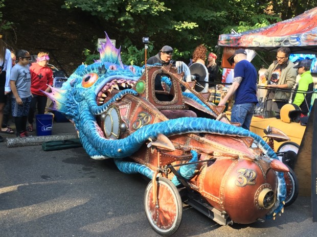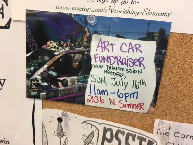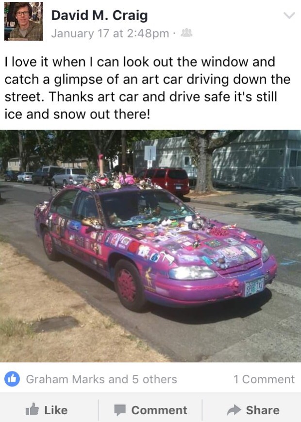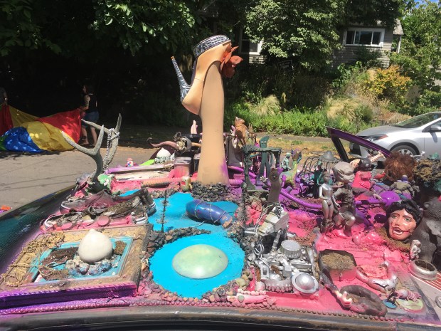 Is there local activity for art cars? There used to be. There’s a lot of them in Portland and there’s a lot of them around here. We did the Hawthorne Fair one time and what they did was they did the parade and then the cars went through that and then they parked up on the side in front of the businesses along Hawthorne because they block off the street well, some of the businesses complained that too many people were crowding in front of the cars and they couldn’t get into the business and so we didn’t go back to that anymore. And then we’ve done the Alberta Street Fair, I think once or twice, and it was the same thing, the businesses were like, “the cars, the cars there’s too many people looking at the cars and they can’t get into my business.” And we tried to explain, “that’s awesome you have like twenty people standing outside your business, like now you need to get them in. We got ‘em here, you need to get ‘em in.” Haven’t done a whole lot lately although when everyone heads up to Seattle in June a lot of them stop over here because Tom Kennedy, he was a huge art car guy, he’s been an art car guy forever and his mom lives up here so everybody stops here and sees his mom because everybody knows Tom or used to.