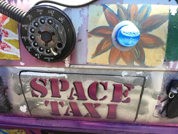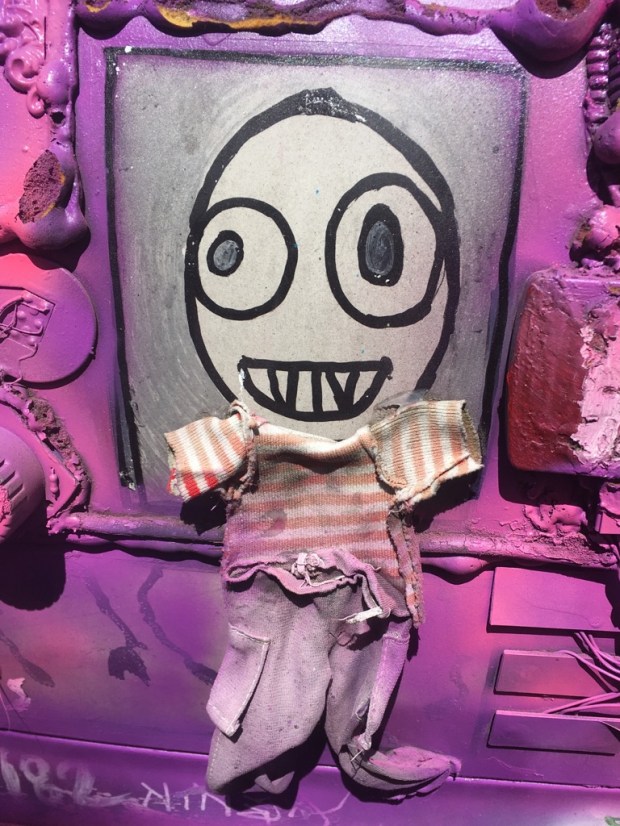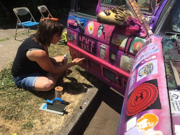 The one last thing, I was wondering about was the type of car and then what made it a good fit to be an art car? Well, anything that’s cheap and ugly because people sell cars that are ugly for cheap and all you need is a coat of paint. I always try to get cars that I can work on or I can get something done easily. When I was down in San Francisco with the Trophy Wife a couple of years ago my alternator went out on the side of the road and it was awesome because we called a couple of places and they had what they called a Triage Van so if any of the cars broke down the Triage Van would stay with you and get you, called a place, went there, got the part, was back at the car, had it all installed in like an hour and a half to two hours. Whereas, you can’t do that nowadays. I mean you get a car nowadays you’re not going to be able to do that with the newer cars and you really need to know how to work on your car. And so I always look for the older things and especially if there’s dings or damages or stuff like that. Like the Trophy Wife, the back seat on the passenger side, I think it got hit at one point or some thing so it was having troubles opening and closing and I just finally closed it and sealed it so you can’t get in on that side, that’s all. You just crawl over the back.