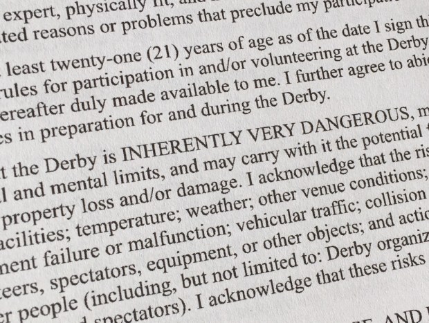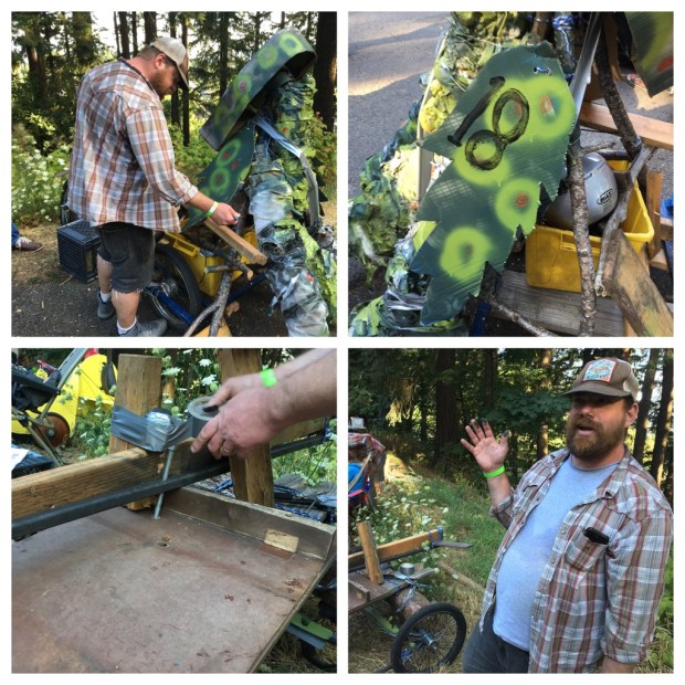 Were there any more kind of adventures as far as collecting all the trophy parts? I have gone to events. Have you ever heard of Combine Demolition Derby? That’s fun. Up in Lind, Washington there’s this thing called the Combine Demolition Derby and it’s always the weekend of Father’s Day and we went to it in the late ‘90’s. Somebody was like, “oh we have to go to this.” The idea is four combines go in and they bash the hell out of each other until one of them comes out and then the ones that are left after that, because there is usually five or six heaps, go in and bash each other until somebody comes out. You can only do twelve welds per combine to alter it and the thrashers can’t be more than, I think it was, 12 or 15 inches off the ground and the thrashes don’t work. So we started going up to that and one time we were up in Ritzville and we’re at a bar and there was like three different art cars out there because we’d go up there and they wanted us to be in the parade which is fun because it’s only three blocks long and then they’d feed us pulled pork and potato salad in the park. So we’re in this bar and this guy is talking, “did you see those cars?” and we were like, “yeah, those are ours.” And he’s like, “Yeah, who’s is the trophy one?” I’m like “well, that’s mine.” He goes, “I got something. You wait here. I’m going to run home and we’re like, “really?” And he came back and he had a trophy that he won, I think it was bowling, and it was a horse’s ass. And he’s like, “will you put this on your car?” and I said, “sure let’s go out and put it on right now. “So we went out and put it on—the horse’s ass on the car. There’s been other ones every now and then friends will be like, “oh I was at this garage sale and I saw this great trophy.” I have a couple of Police Officer shooting (trophies), animals are really hard to find, bowling ones are easy but then I’ve had people that have won them, you know when they were kids and they’ve given them to me and I’m like, “sure let’s put it on.”