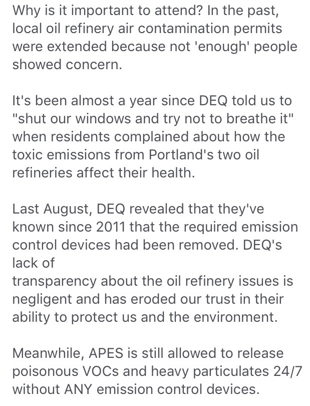 In my professional video production days I was paid to go to public forums and government meetings. Sometimes you have to do things when there’s no payday involved. On Tuesday, March 7, North Portland community members gathered in a conference room at the Red Lion Inn for a meeting that concerned a permit for an oil recycling business on Hayden island called American Petroleum Environmental Services or APES for short. It was inevitable that we would make an effort to find out more about area air quality issues since we had been encountering an ongoing chemical odor in our Kenton neighborhood since the days we first moved in eight years ago. I lived with it and listened to the complaints. My running joke was about how sometimes, when the wind was right, we were treated to the scent of cookies from the nearby snack factory. More often the air has been filled with the byproducts of the industrial goings on that lie between the Columbia slough and businesses along Columbia Blvd. The Sunday morning before the meeting, my wife Ronna, had been watching videos about air issues in our vicinity. One showed an infrared image of a smoke stack with waves and bubbles could only represent insane toxins spewing into out atmosphere. The image cried out for some industrial music in the vein of Tone Ghosting in the background. It was scary visualizing what’s going into the air knowing I’d been breathing and smelling that. There were also videos of a woman talking about the situation in the manner of a fireside chat detailing the work of her North Harbor Neighbors group and their concerns with the performance of the State’s Department of Environmental Quality.