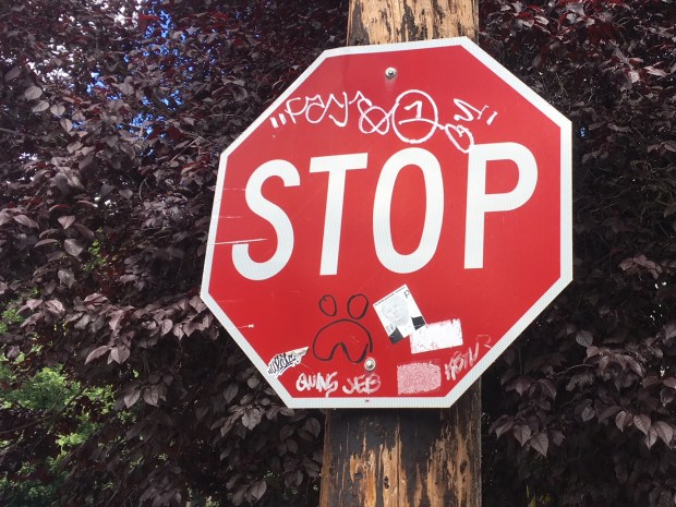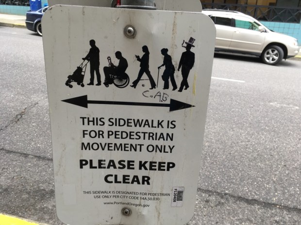 At a Portland Public School site in Northeast, a sign benefits from an additional sticker or drawing. All signs should be rendered this interesting. No matter how much someone enjoys climbing on roofs they have to realize it’s not as fun as having to spend time in a court.