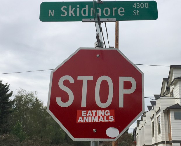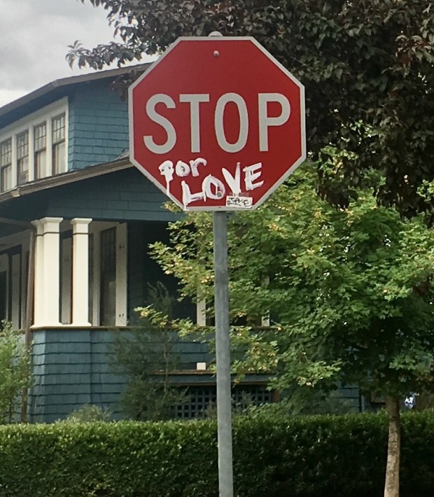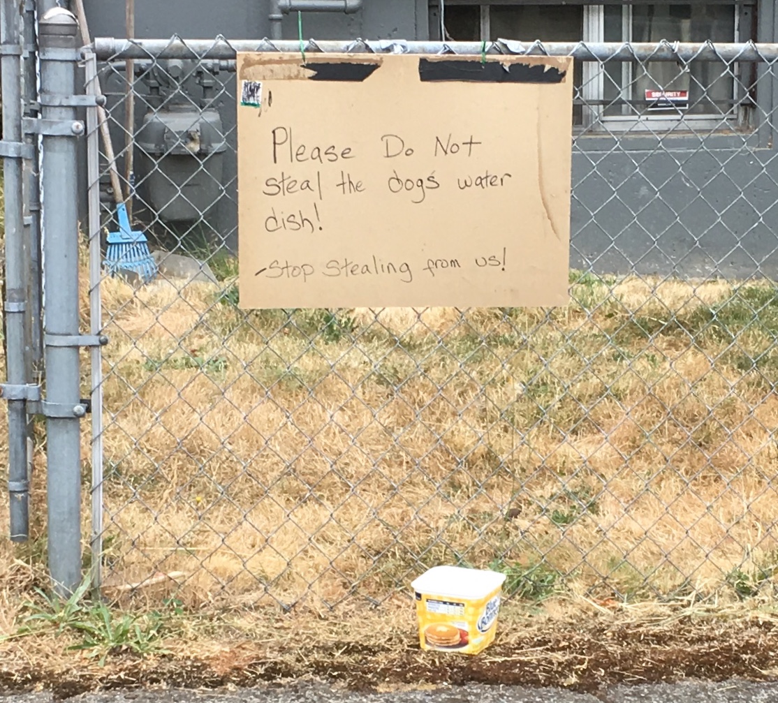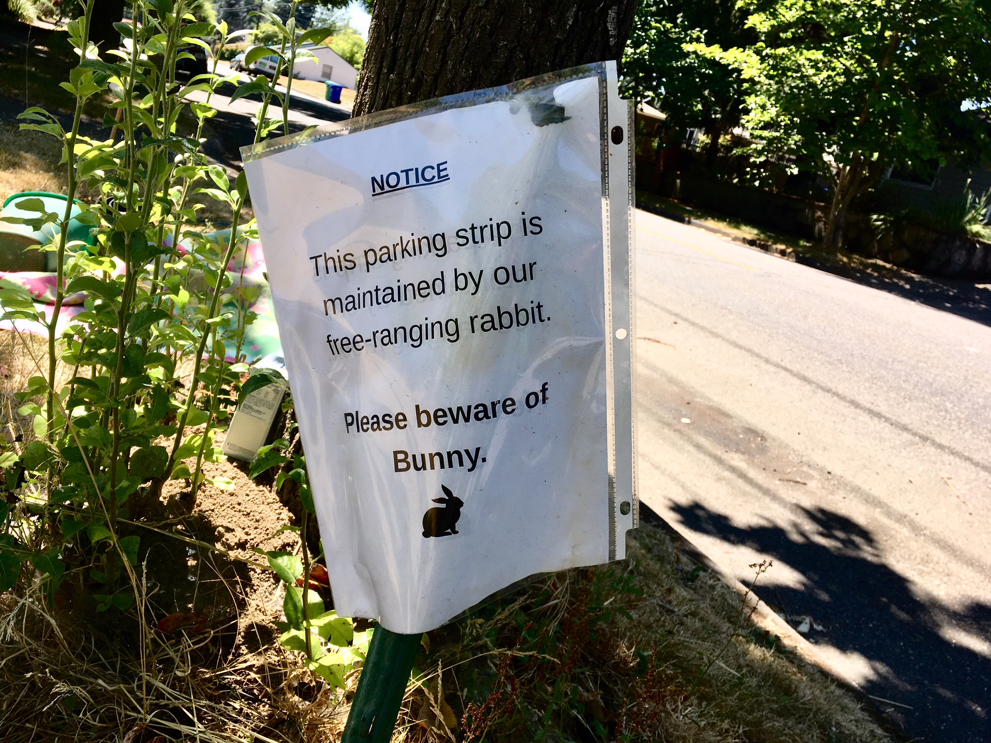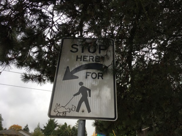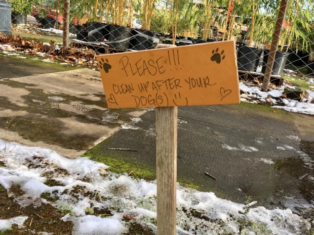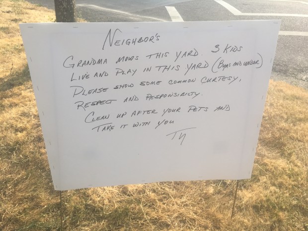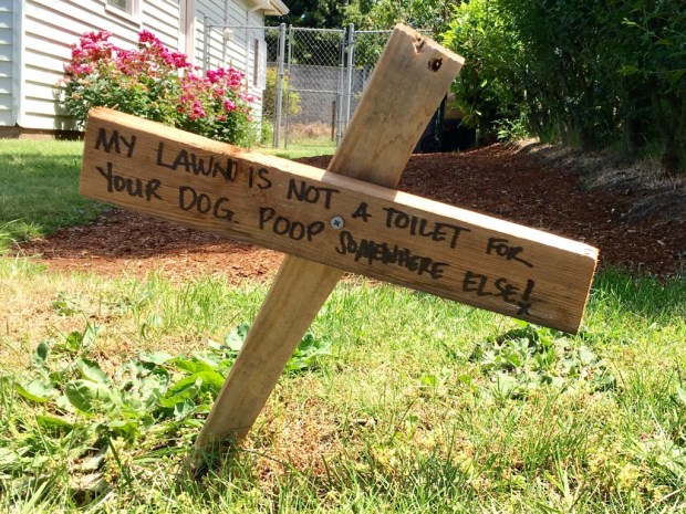 No one wants pet waste from pets that aren’t their own on their lawn. It’s not like people ignore pleas they’ve planted in their yards. These signs, cranked out for purchase, feature a happy dog and three exclamation points. This message seen in West Portland Park makes the signs spotted in Multnomah Village encouraging dogs to do their business make even less sense.