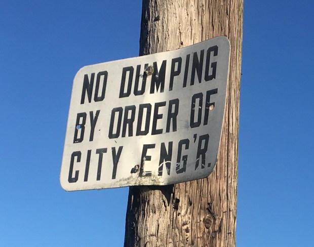 I was amused to see a no dumping sign getting specific with examples of what not to dump. While the sign is pointing out that nothing should be dumped, it’s illustrated with a trash bag, tire and washing machine that should not be tossed aside to rot and rust and become someone else’s disposal hassle. The image makes me laugh at the realization that the popularity of pick up trucks makes it easy for people to pull up with their pony tail wearing driver/accomplice and empty a bed load of junk anywhere they choose to ignore a no dumping sign.