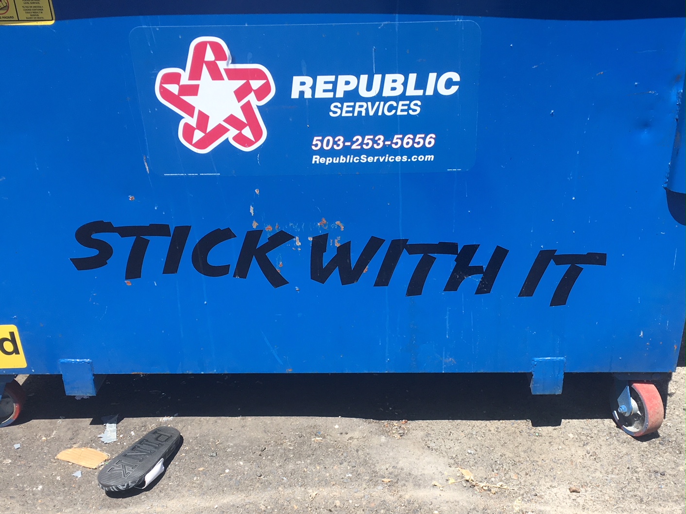 An old sign in the West Portland Park neighborhood used to do it’s duty. Now it looks like it’s been dumped itself. The message is clear enough to keep this patch of wilderness trash free and it’s more intimidating. A Wheel of Fortune watcher could fill in the blanks without buying a vowel.