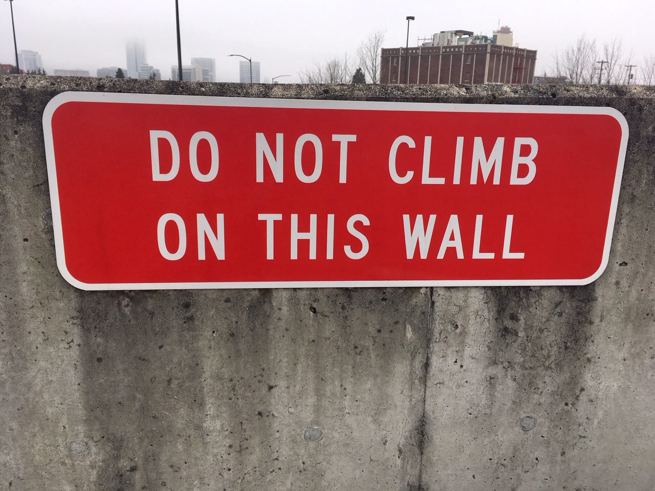 The sign may not keep anyone away from the temptation of climbing this wall in the parking lot of the Memorial Coliseum. Red screams danger while the capital letters broadcast a louder warning. It is a long way down to the next parking lot so it is better to be safe than mangled.